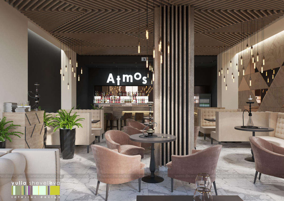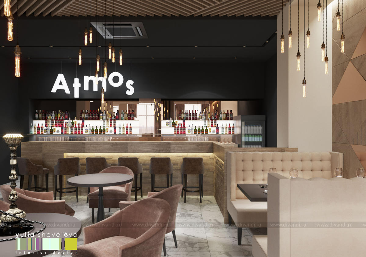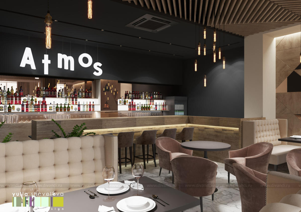 Проект ресторана ATMOS в городе Екатеринбурге. Современный интерьер с элементами эко дизайна, в теплой цветовой гамме и натуральными природными материалами. Здесь нет обилия яркого декора, только легкая и уютная ATMOSсфера.