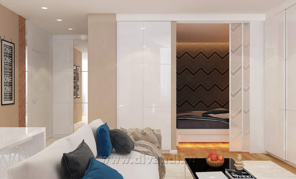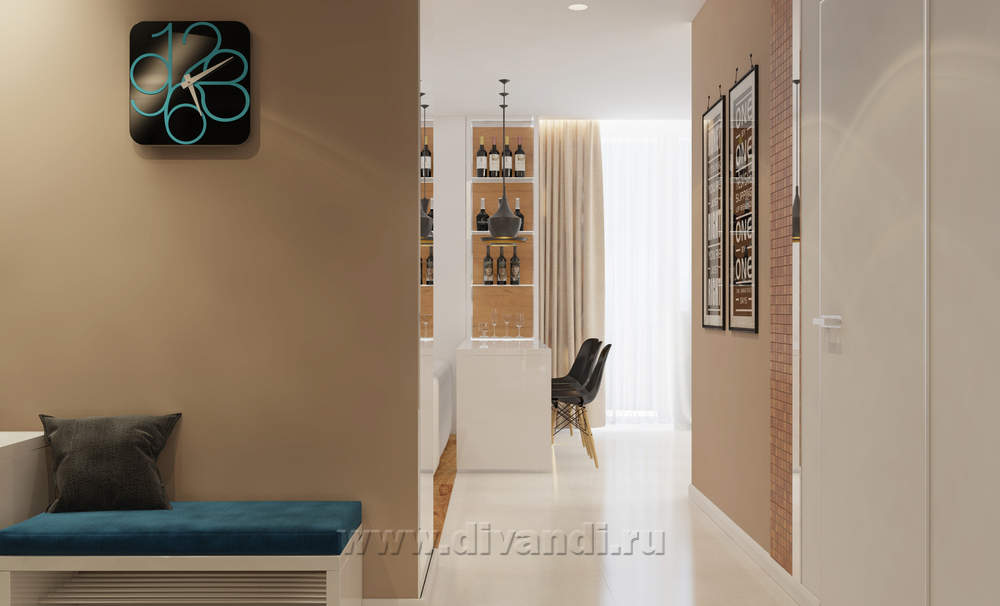 Дизайн квартиры-студии в современном стиле для молодой пары. Задача в этом проекте,как и во всех проектах небольших квартир-студий была создать комфортное для жизни пространство с возможностью уединения, и при этом сохранить "воздух" и зримый простор квартиры.Теплые оттенки и материалы в отделке разбавлены освежающими оттенками сине-бирюзового.