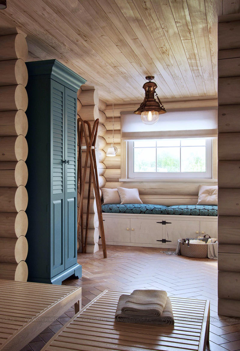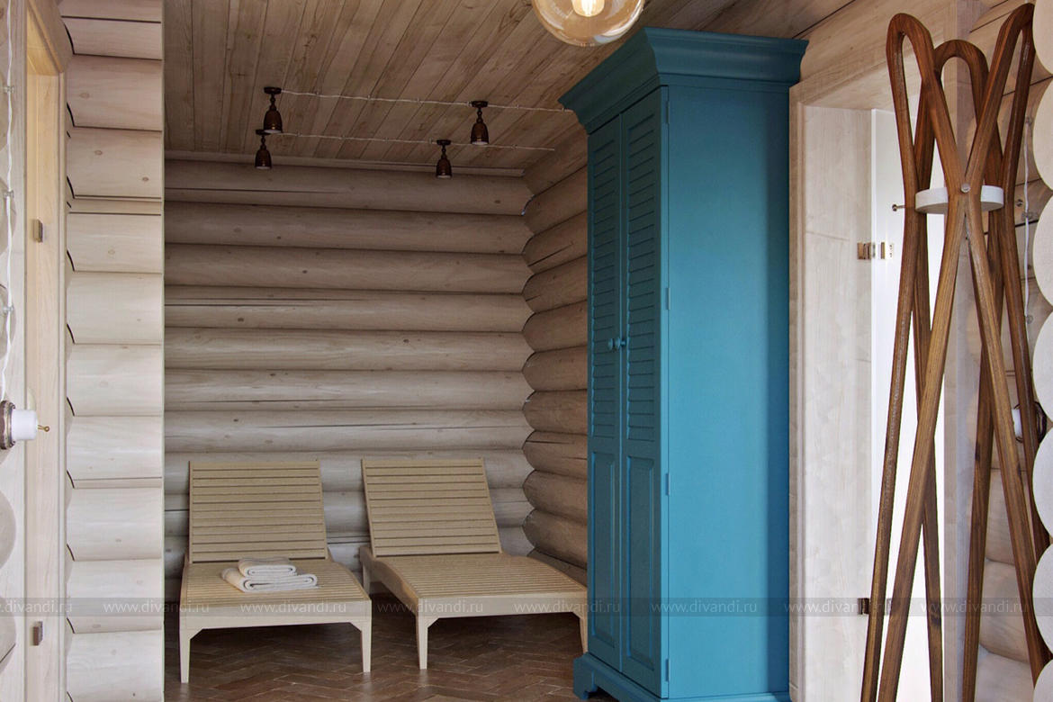 В комнате отдыха, площадью 10 кв.м., расположилась скамья-сундук с мягким сиденьем, вешалка для одежды и шкаф для полотенец. Топка печи находится снаружи бани. Она облицована черной жаропрочной плиткой в цвет стульев на кухне.