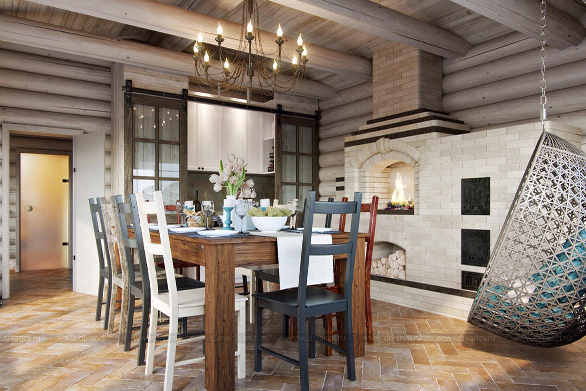 Очень часто чтобы создать уют и красоту не требуется много вложений. Стол и стулья из Икеа. Стулья покрыты морилкой разного цвета; красные – в цвет фасада, молочные – в цвет мореных стен, черные – в цвет отделки камина. Маленькая кухонька спряталась за раздвижными дверями. При желании ее можно скрыть, хотя даже при открытых дверях она не бросается в глаза.