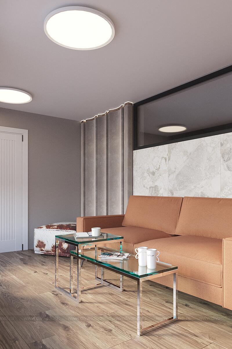 тёплый терракотовый цвет дивана служит выразительным акцентом;