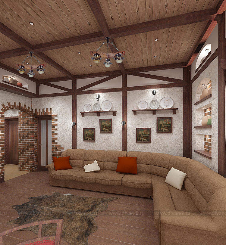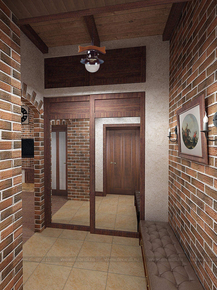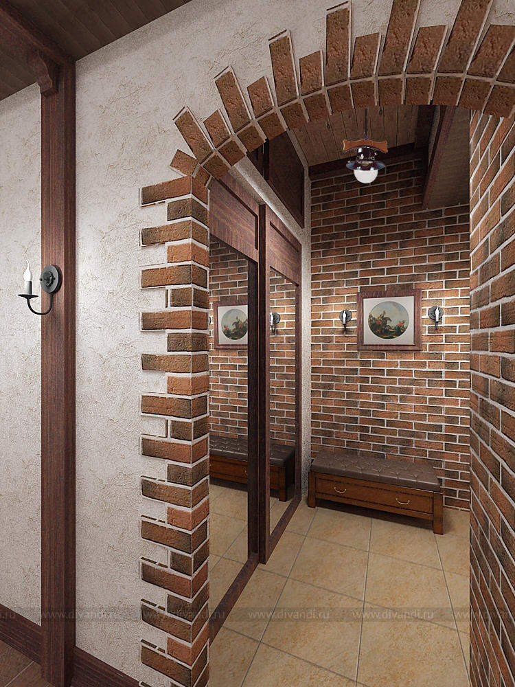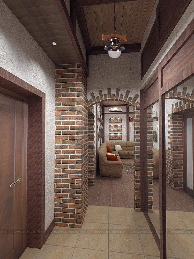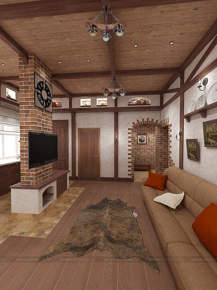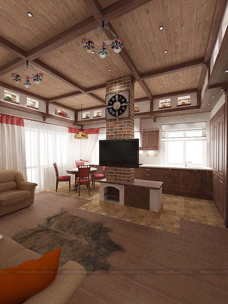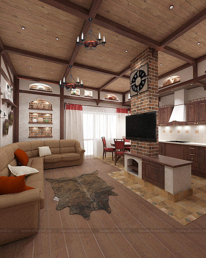 Пространство гостиной, кухни и прихожей с элементами немецкого кантри.