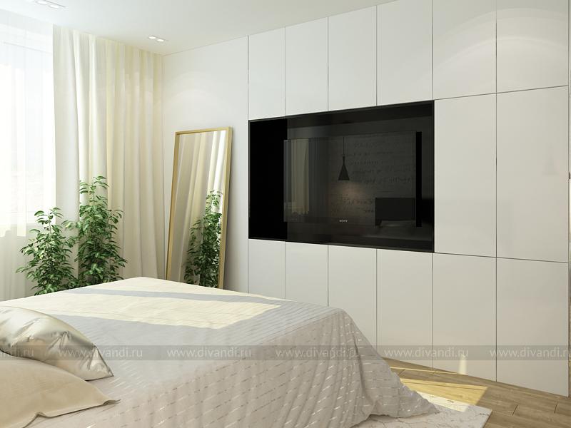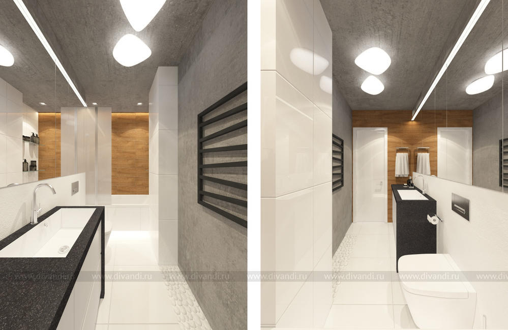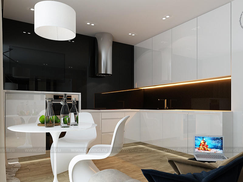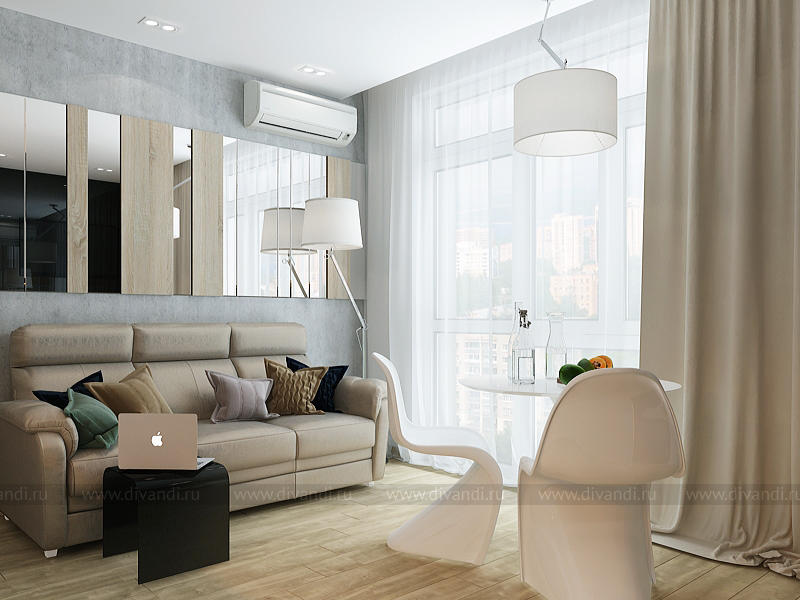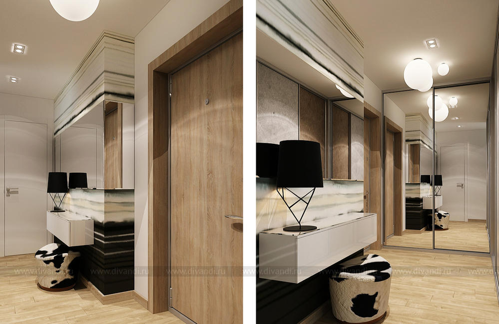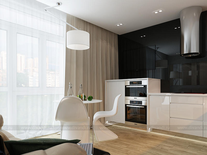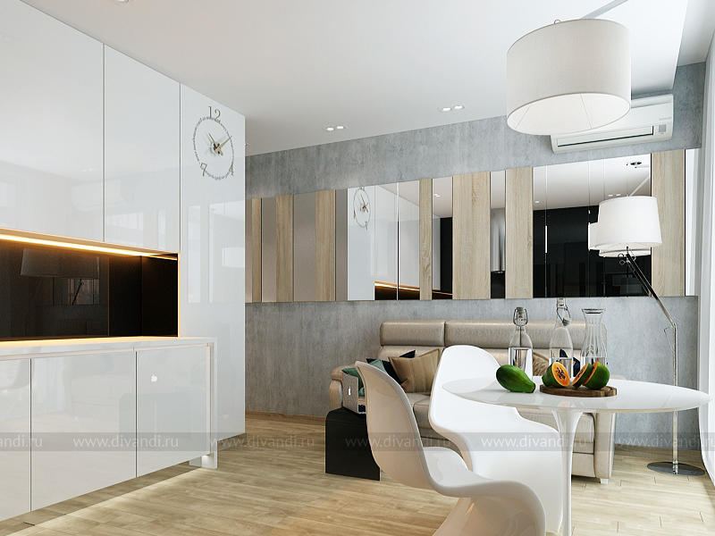 Супружеская пара заказала дизайн-проект однокомнатной квартиры (47,7 кв.м.), основными задачами которого было создать спокойное и гармоничное пространство, на котором будет размещено все необходимое. Разместить все необходимое, а именно зону спальни, гостиной, кухни, столовой, а также много мест для хранения позволила грамотная планировка. А вот спокойствия дизайнеры достигли неожиданно - за счет игры контрастов бетона и глянца, дерева и зеркал, белого и черного.
