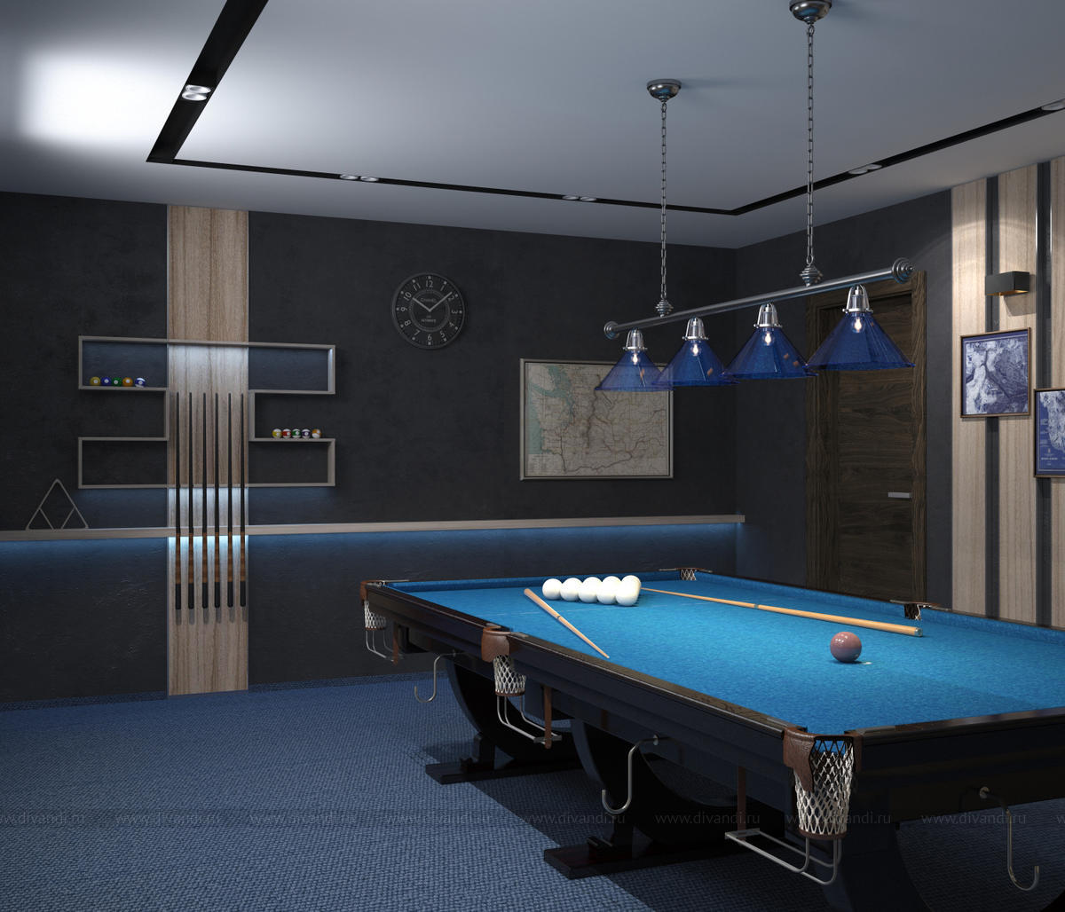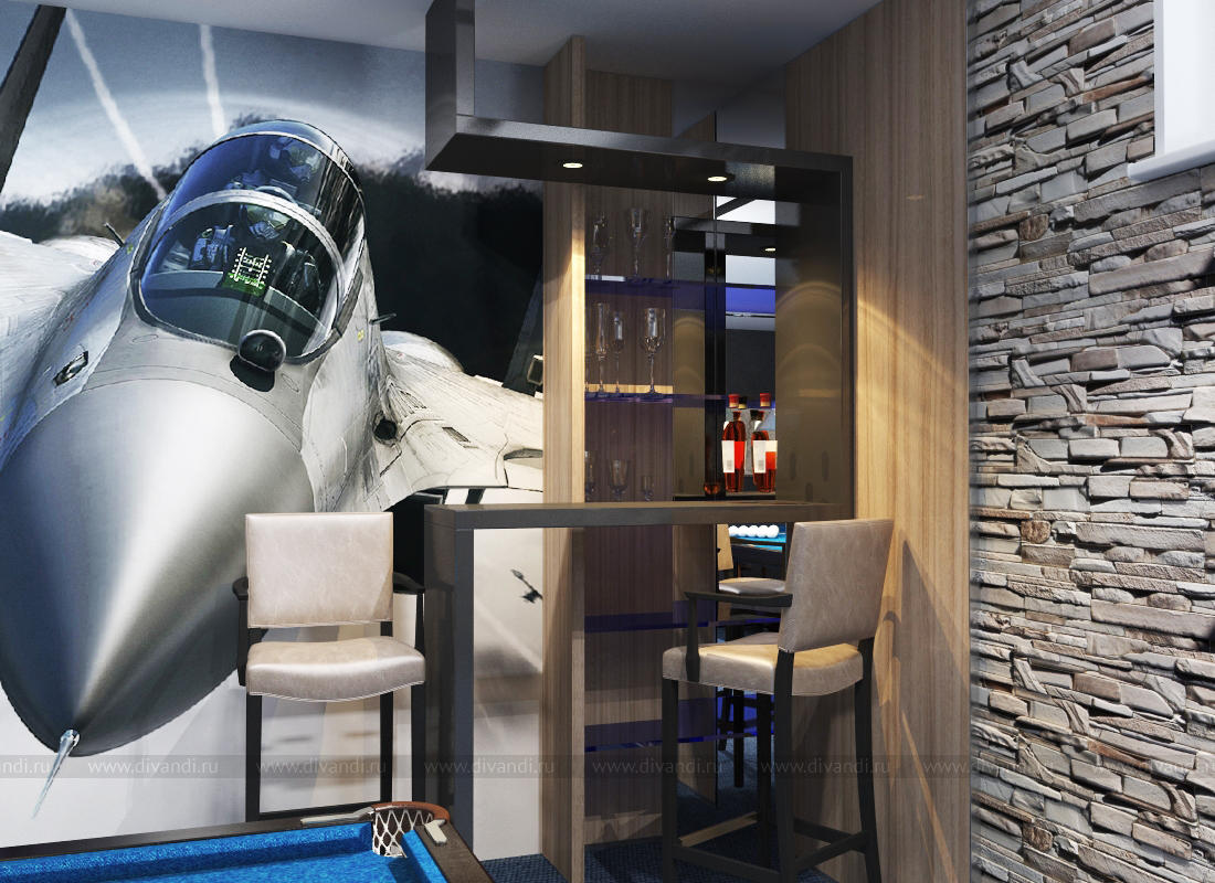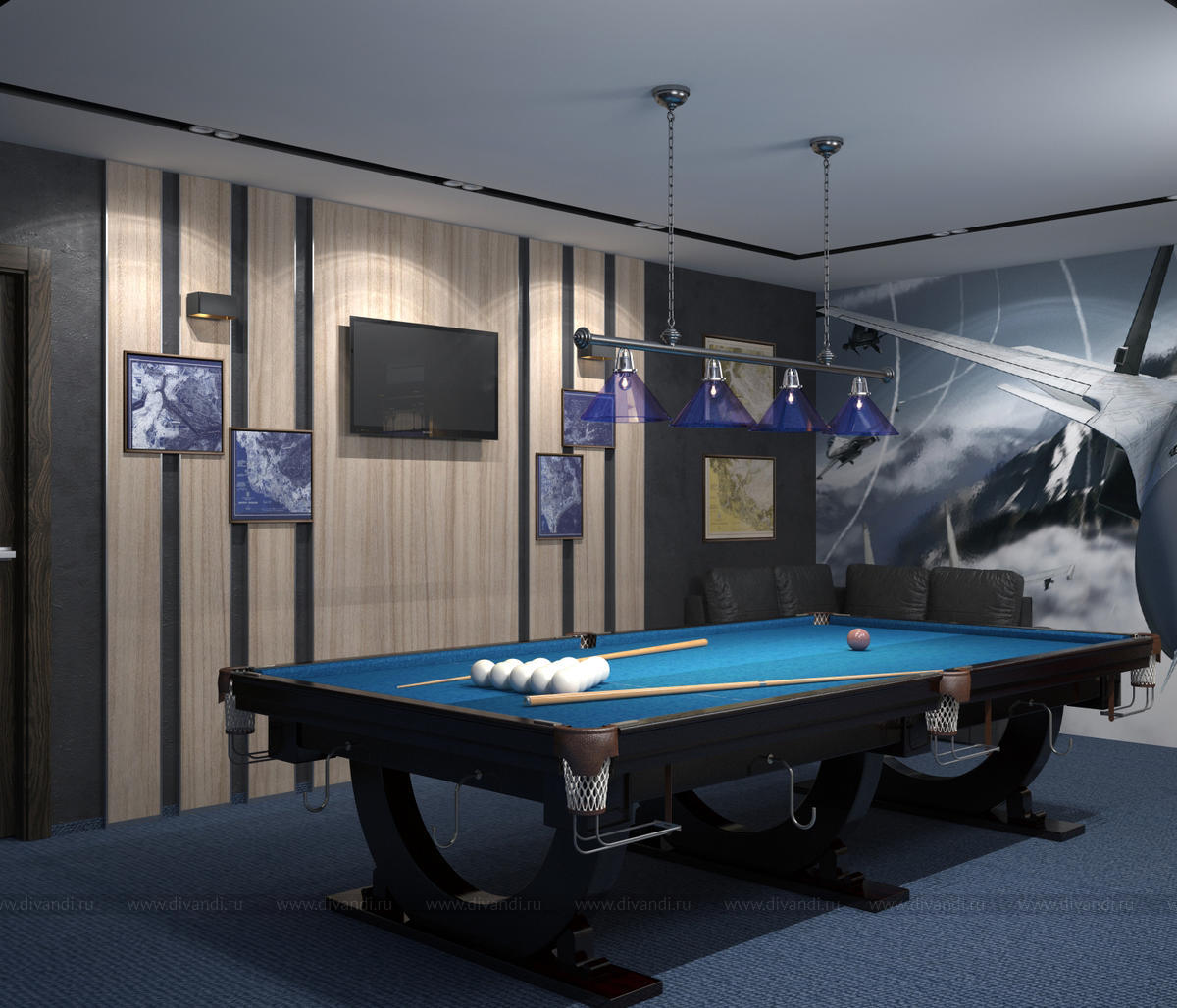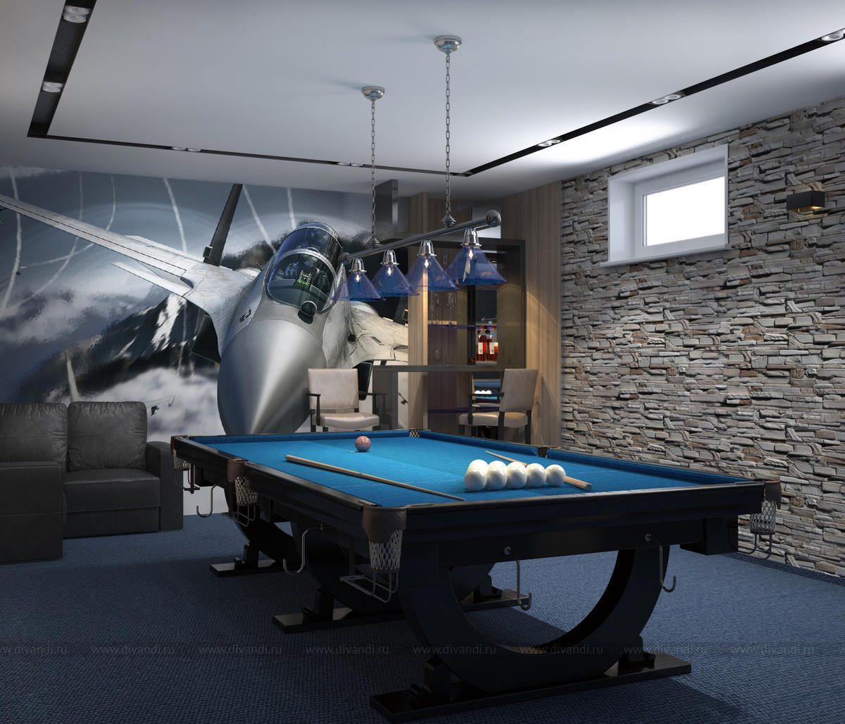 Биллиардная выполнена в современном стиле, с применения современных материалов. Основной акцент-постер с изображением истребителя