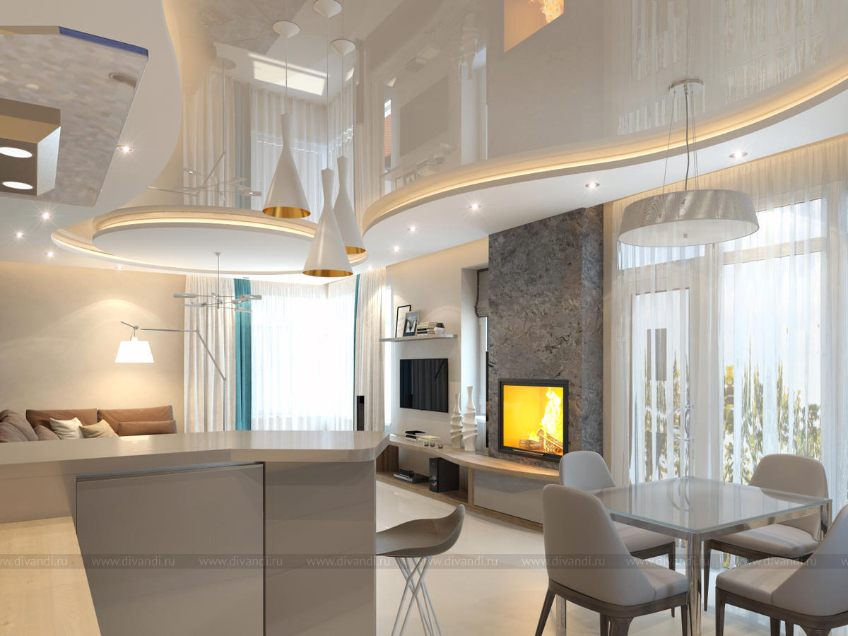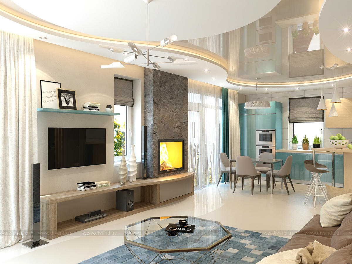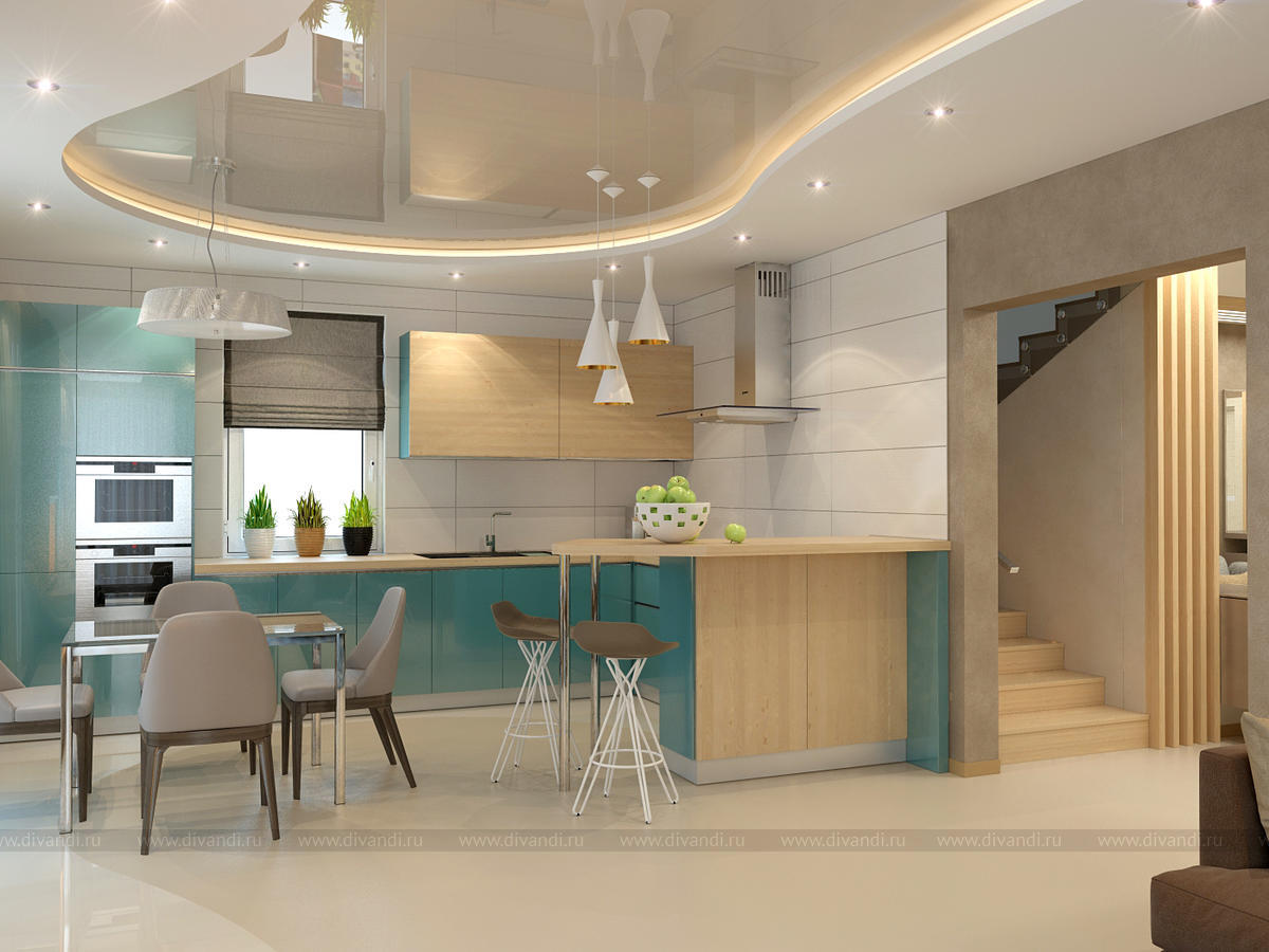 Дизайн кухни-гостиной в бирюзовом цвете, Московская область