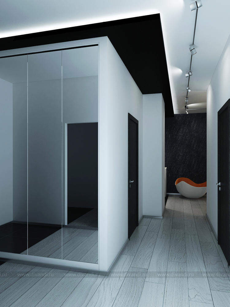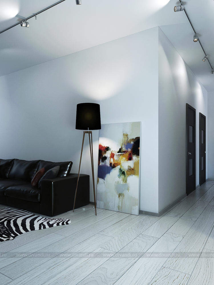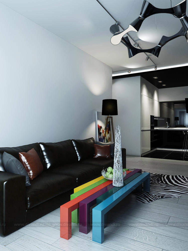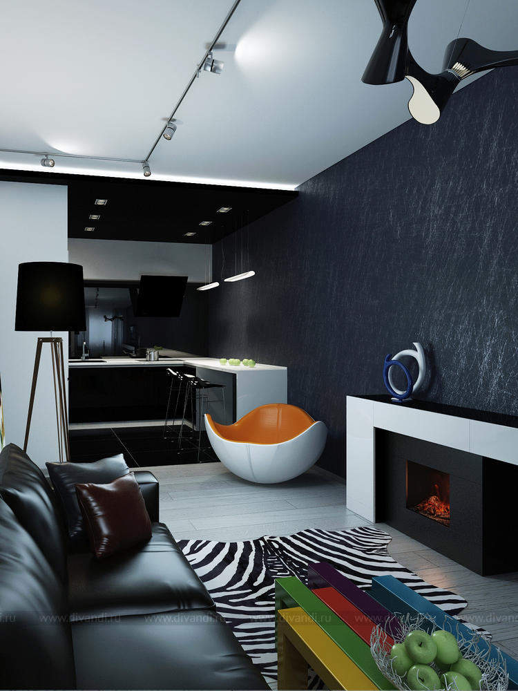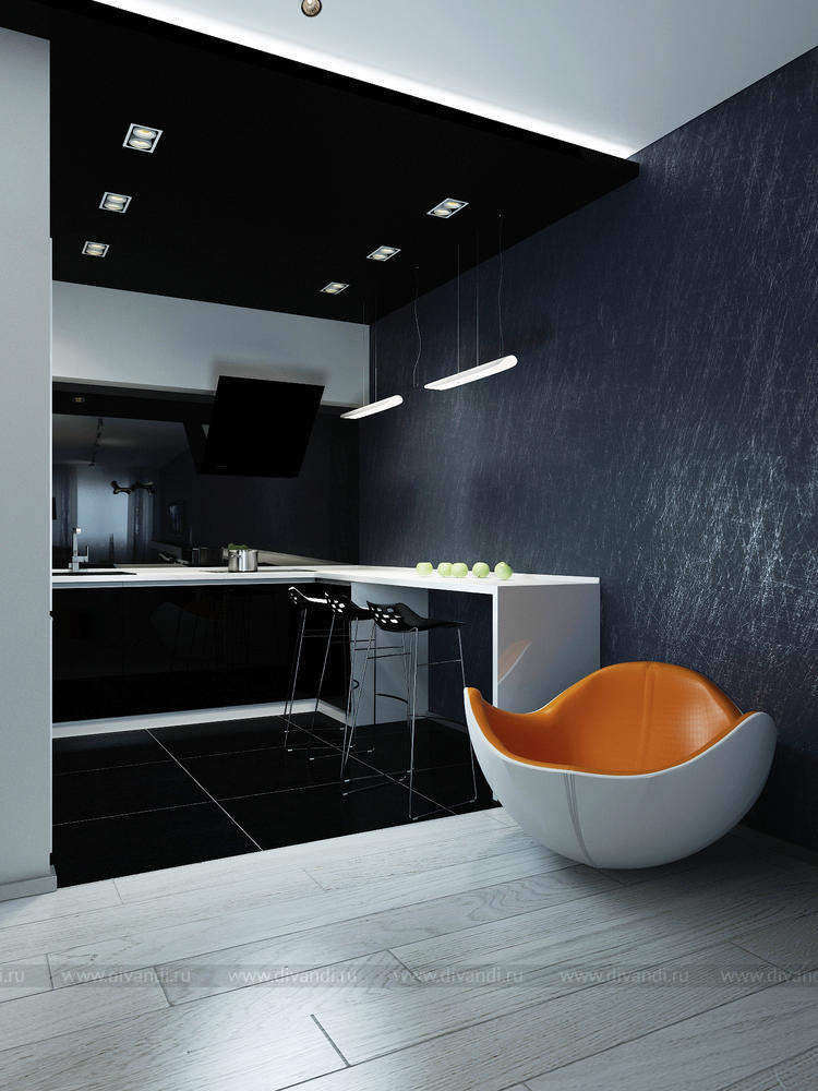 Квартира находится на последнем этаже высотки, с потолками высотой три метра. Концепция интерьера строится на контрастном сочетании черного и белого: уровни потолков, предметы мебели и аксессуары представляют черно-белое воплощение. Интерьер замиксован дизайнерскими предметами, такими как футуристичное кресло Placentero Lounge, светильниками плавной, перетекающей формы в противовес строгой прямоугольной конфигурации хай-тэка. Участвует в фестивале "Интерьер Возможностей-2014"