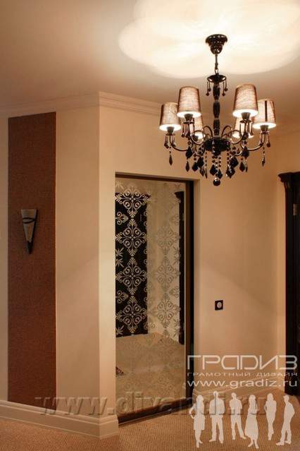 Узкий коридор спроектирован в светлых тонах, на одной из стен зеркало, что позволяет визуально расширить пространство. Детская изначально являлась комнатой с самой сложной конфигурацией, практически все ее углы были острыми. Дизайнеры закрыли углы нишами и функциональным встроенным шкафом, гармонично вписав их в интерьер детской комнаты. Комбинирование люстр, бра и встроенных светильников позволяют создавать различные световые сцены и менять освещение в зависимости от настроения.