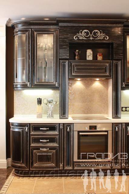 Классические кухни чаще всего выполнены в различных оттенках коричневого дерева, поэтому смелым и эффектным шагом стало применение в интерьере чёрной классической кухни с эффектом состаренности.