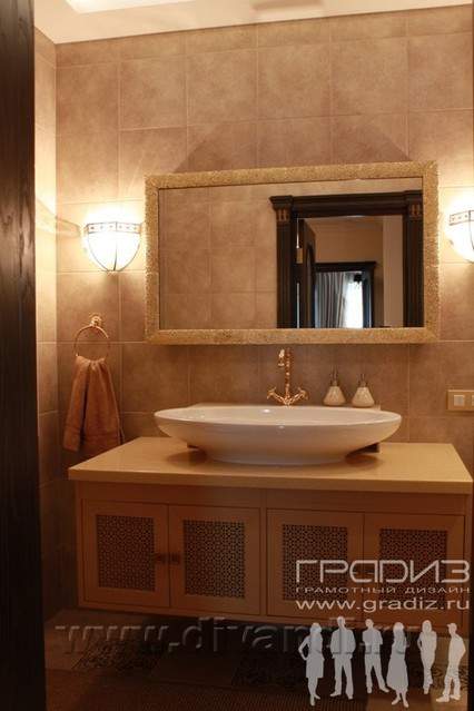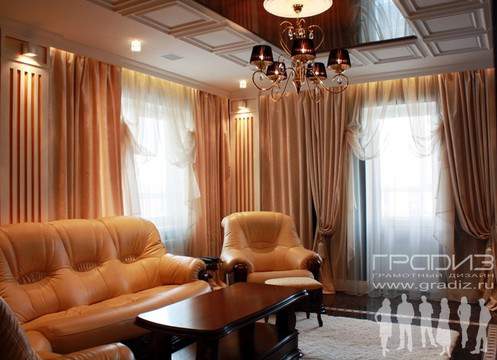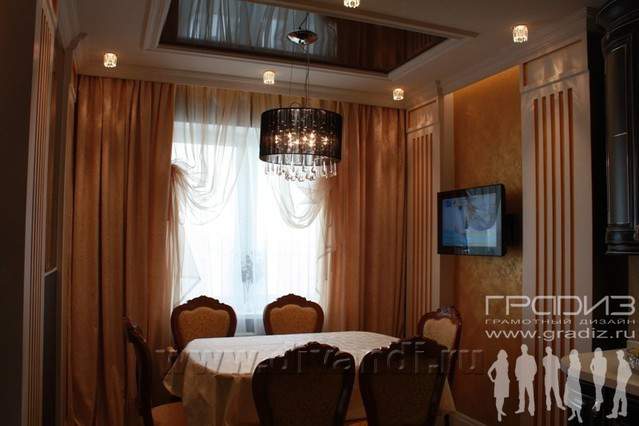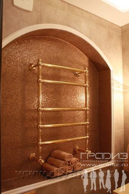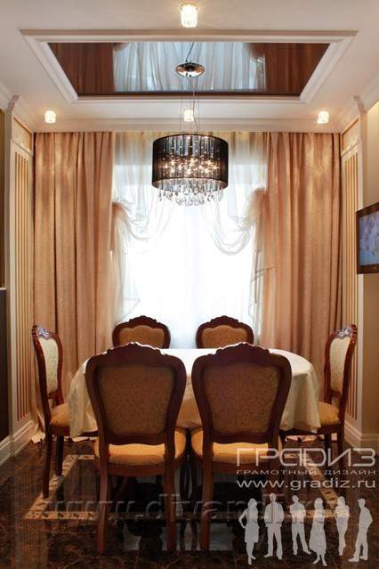 Доминирующими цветами в интерьере стал золотой, бежевый и коричневый. Такое цветовое сочетание является символом благородия, богатства и изобилия. По фэн-шую золотой цвет обладает свойством укреплять физическую и психическую силу человека.