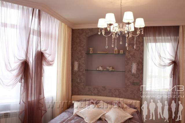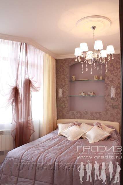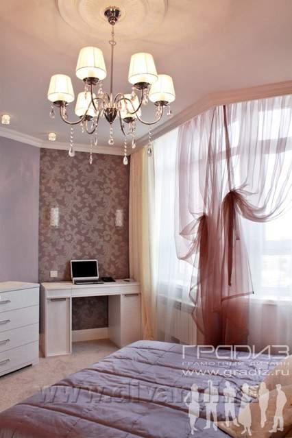 В интерьере спальни использованы оттенки серого и фиолетового. Фиолетовый цвет для интерьера спальни идеален. Его основная «миссия» - создание гармонии в окружающей среде, поэтому, по фэн-шую, этот цвет имеет исключительно важное значение. Фиолетовый цвет обладает успокаивающим действием на нервную систему человека, исцеляет от бессонницы, пробуждает энергию подсознания.