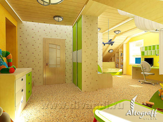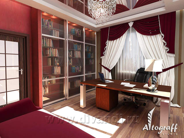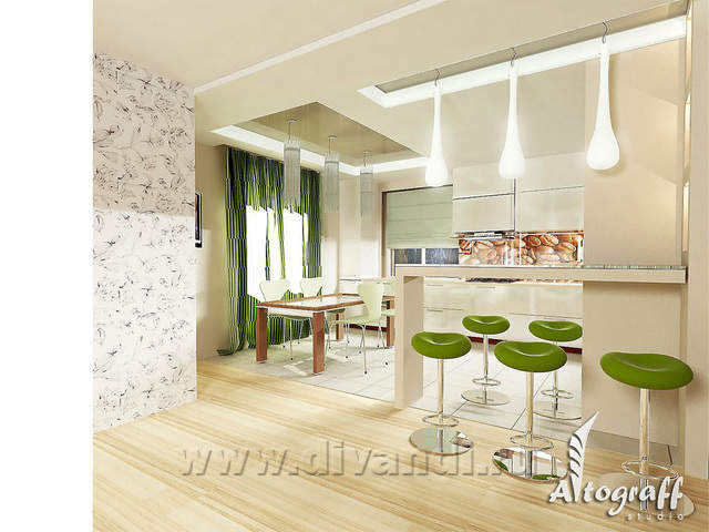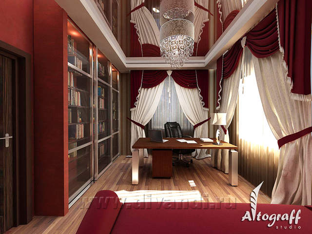 При знакомстве с заказчиками первой их просьбой было совместить в доме 2 любимых, но противоположных стиля – классику и современный минимализм. В доме будут проживать 3 поколения. Поэтому дом получился очень разноплановый по стилю и мироощущению. Единое пространство гостиной-кухни получилось теплых природных фисташково-песочных оттенков, здесь есть намек на классику, но основной мотив – лаконичные современные формы. Классический каминный портал стал центром гостиной. Стену за камином мы обыграли росписью в форме большого белого цветка. Кухонно-столовая зона получилась светлой, но на фоне нее выступает акцентом яркий стеклянный фартук с печатью «кофейные зерна», создающий тепло и настроение на целый день. Холл перекликается по цветовой гамме с гостиной, так как плавно через открытый проем перетекает в нее. Пол в нем интересно решен плиточным панно с разворотом на 30 градусов, для создания динамики пространства, направленной на гостиную. Кабинет по просьбе хозяина дома решен в бархатных бордовых цветах, в классическом стиле, но с современной мебелью. Второй этаж дома – это приватная зона спален – решен совсем по-другому, здесь преобладает разностилье личных пространств каждого члена семьи. Спальня родителей решена в классике с сочными цветовыми акцентами. Детские решены с учетом возраста и пола детей – мальчика 2-4 лет и девочки 10-12 лет. Спальня бабушки решена в спокойном бирюзовом оттенке.