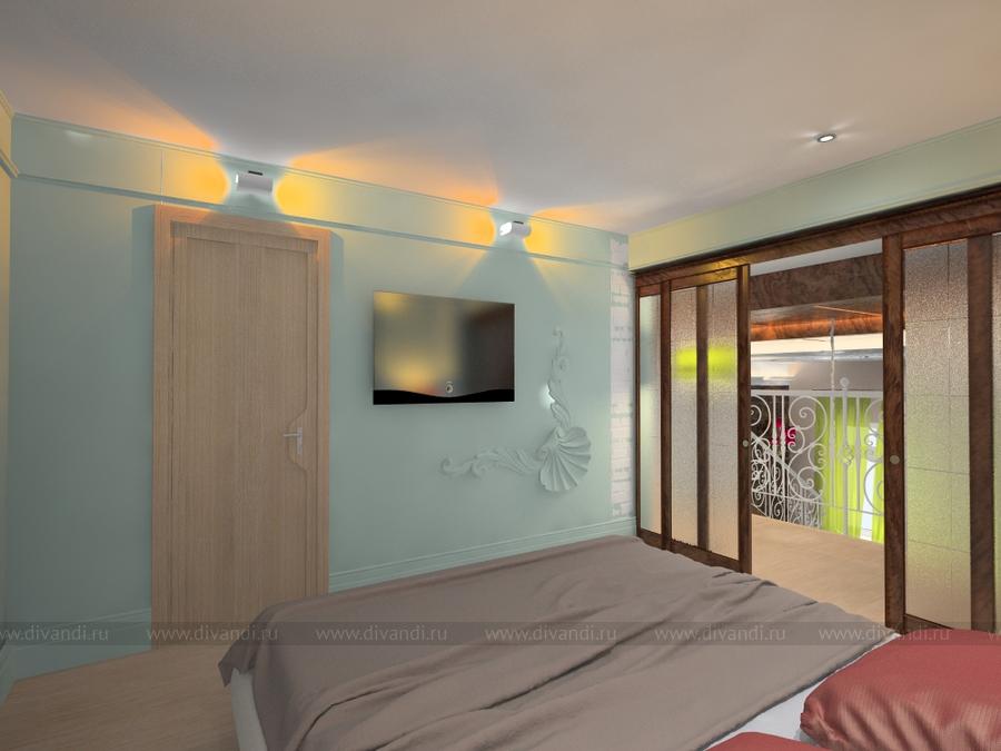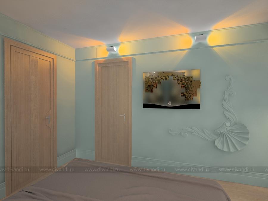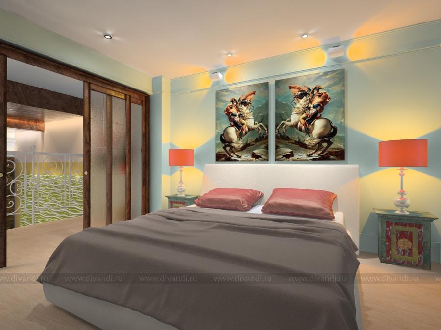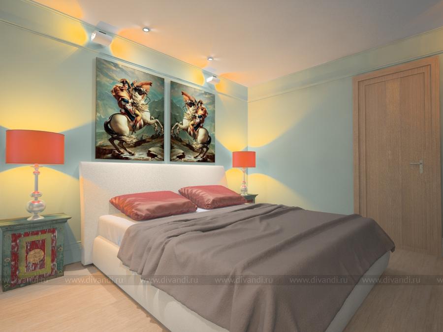 Мягкая фисташковая гамма на стенах дополнена теплотой дерева на полу и дверях. Искусственно состаренные две тумбы по бокам кровати с королевскими медальонами прекрасно дополняют центральный элемент в комнате – две картины над кроватью Наполеона Бонапарта как символа завоевателя. Из-за небольшой высоты помещения использовали прием двойного молдинга и цвет стены на месте стыка с потолком имеет с ним общий цвет, что дает зрительное ощущение увеличения высоты и поднимает его уровень.