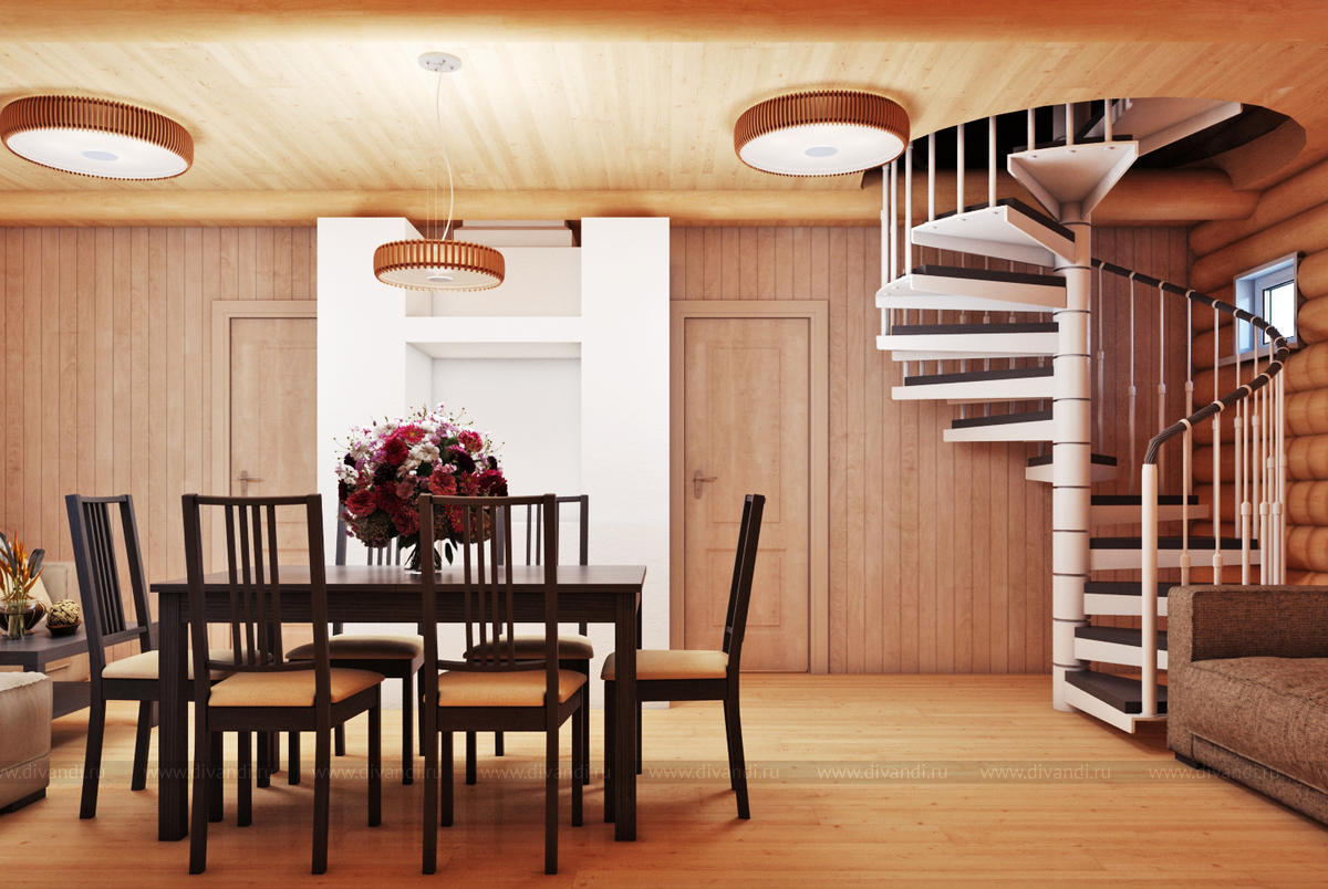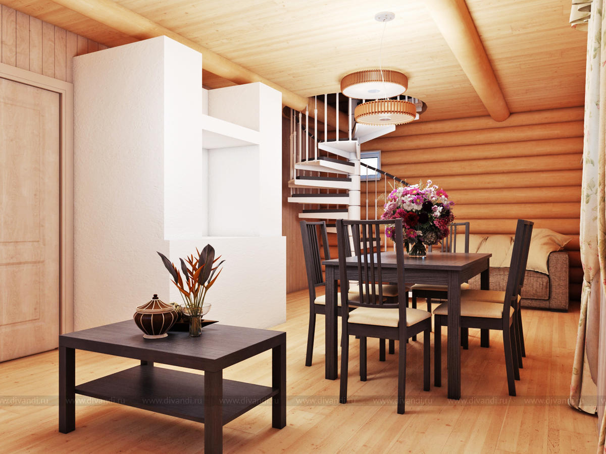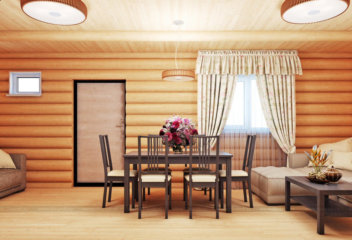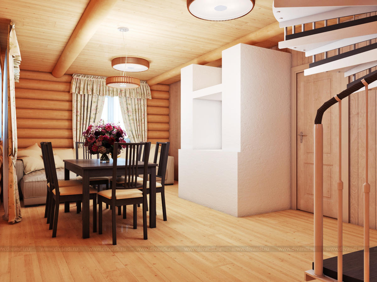 Заказчики себе сделали дом из бревна на острове в районе Волги. Дом рассчитан на кратковременное пребывание там, отдых. В мебели принципиальное пожелание было использовать ассортимент "икеа", в светильниках - аналоги итальянских фабрик.