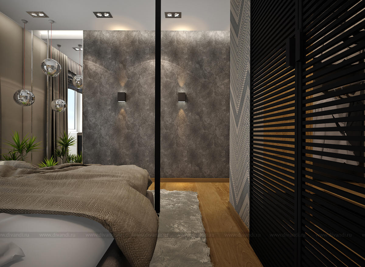 Проект спальни для молодого человека. Спальня выдержана в монохромной гамме с применением теплого цвета дерева. Выделили в спальне зону гардероба, т. к. спальня выходит на солнечную сторону-мы организовали зону с зеркальными поверхностям, которые будут создавать непередаваемую игру света.