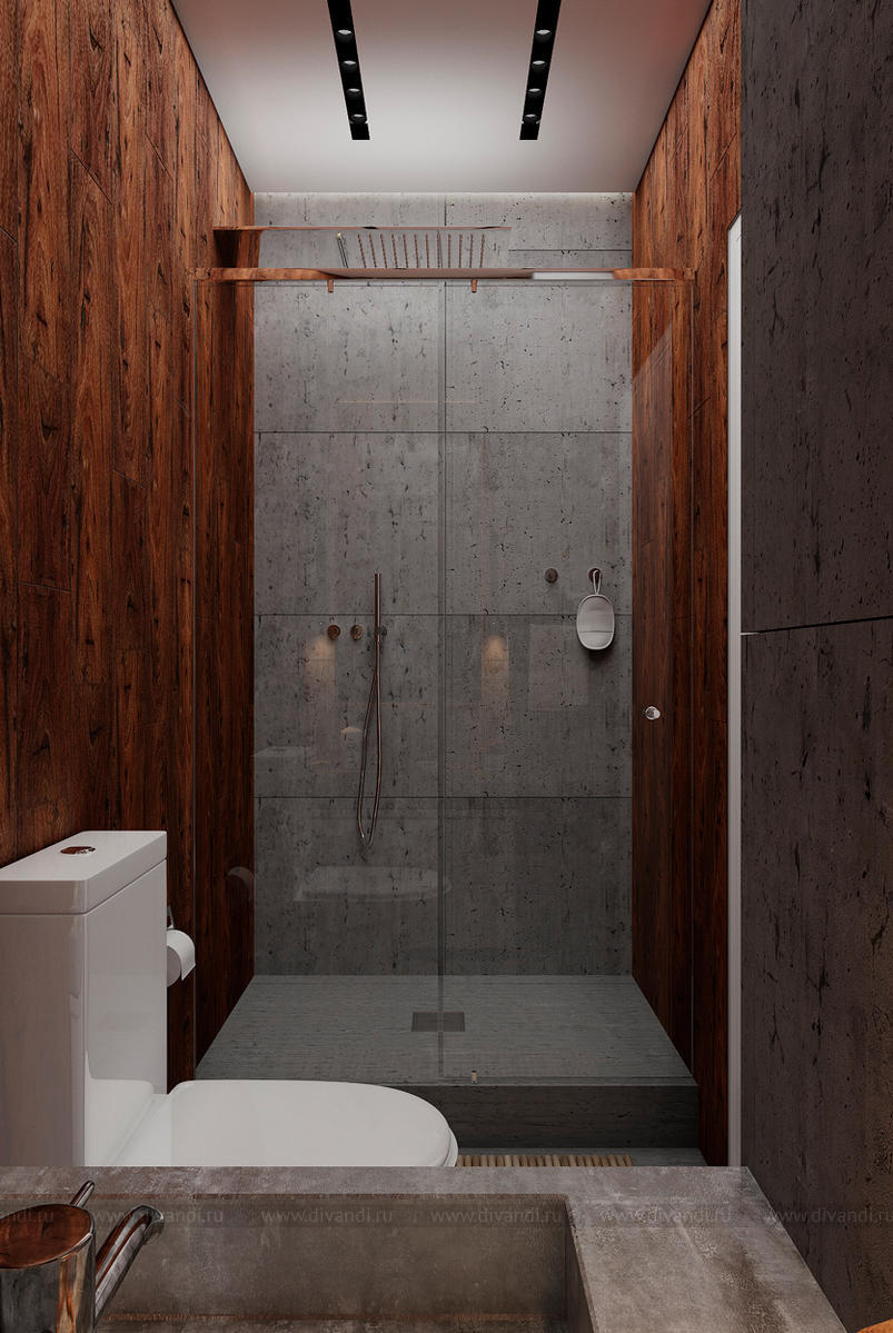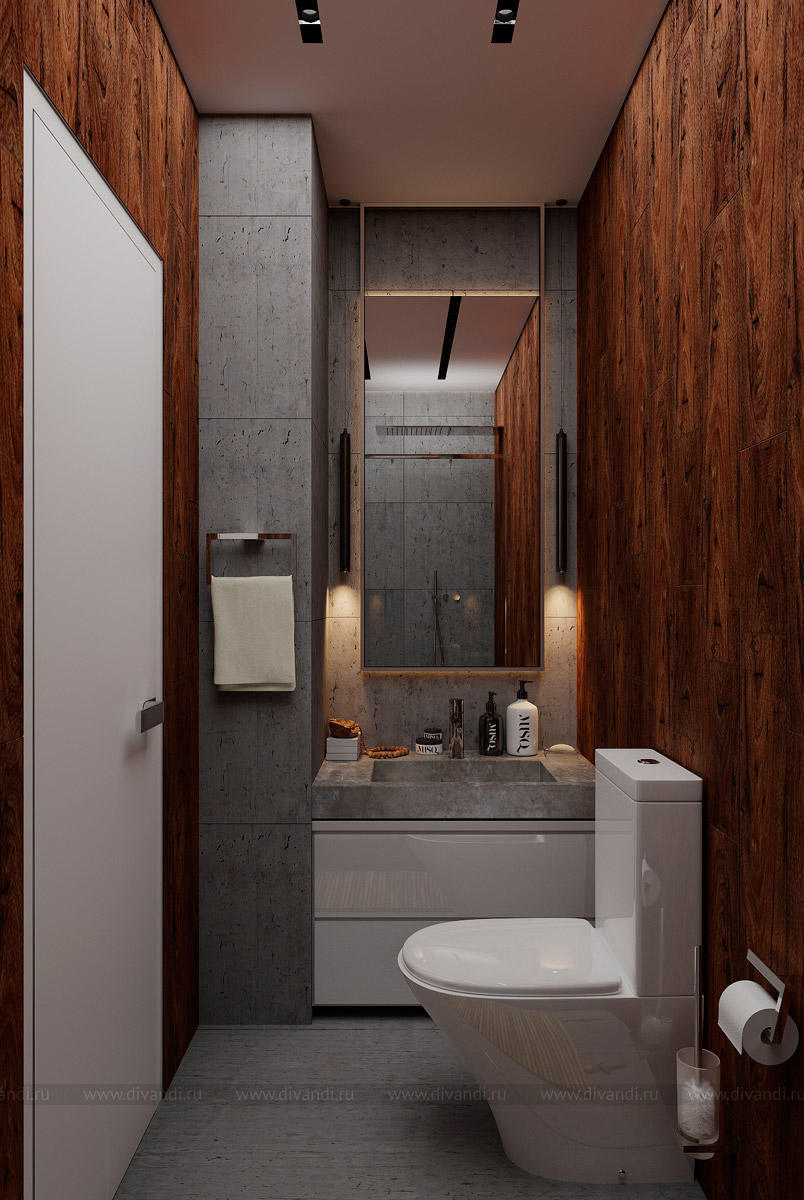 Модные бетонные и деревянные фактуры создают в санузле гаражный стиль - неожиданно и выразительно!