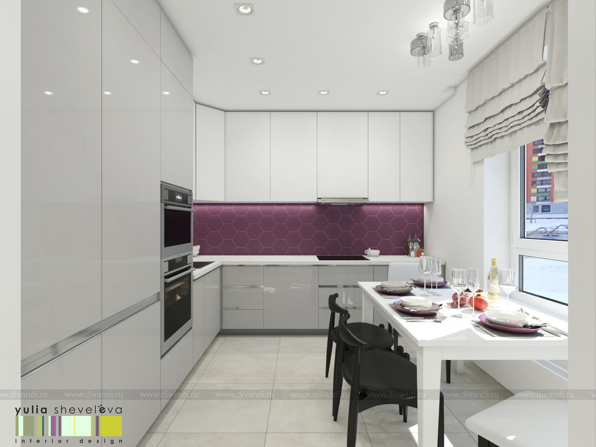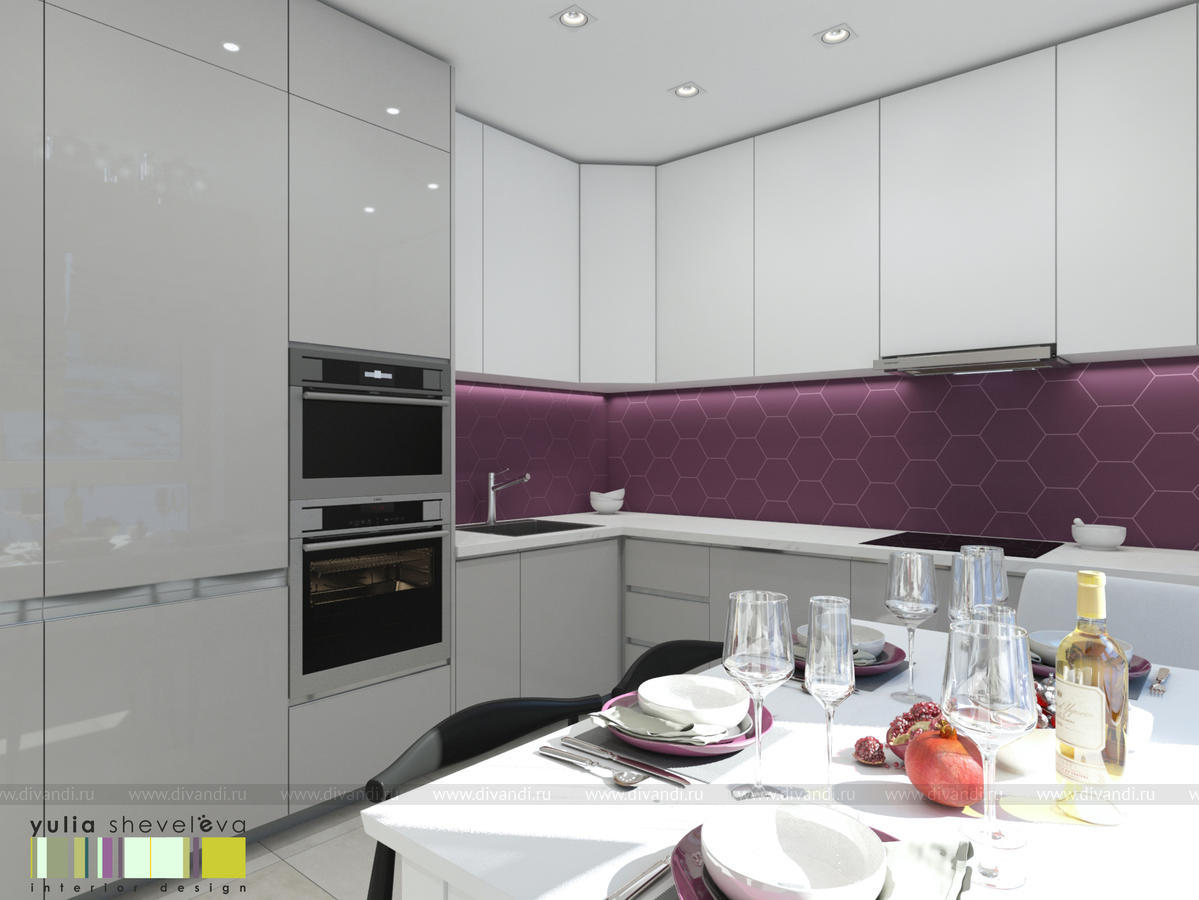 В кухне и гостиной в дополнение к серо-голубой гамме добавился брусничный акцент в виде цвета плитки на фартуке, элементов оформления в мебели и текстиле.