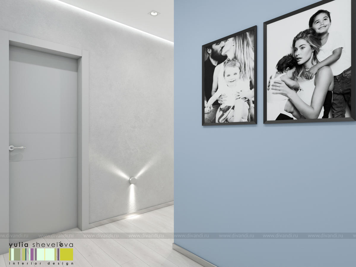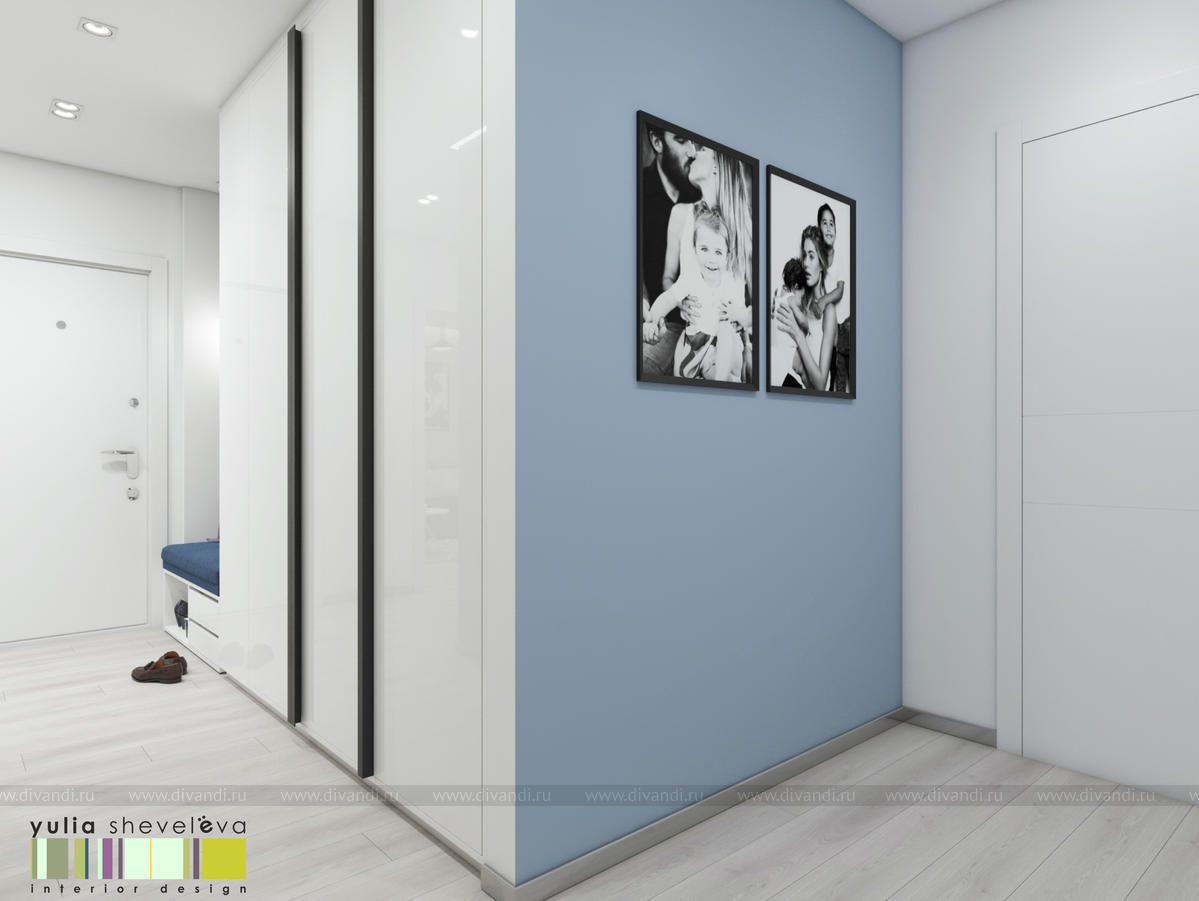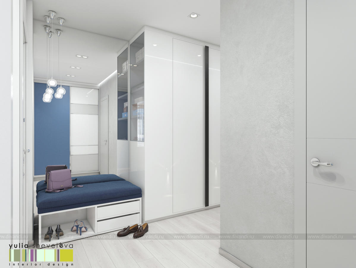 Планировку квартиры было принято решение сильно не менять, лишь гостиная и кухня стали одним общим пространством. Стиль интерьера - легкий и современный, без большого количества декора и деталей. Пастельные голубые и синие тона, светло-серый, белый, различные подсветки - приемы, чтобы создать ощущение открытого пространства и придать воздушности интерьеру.