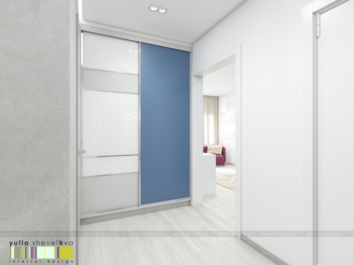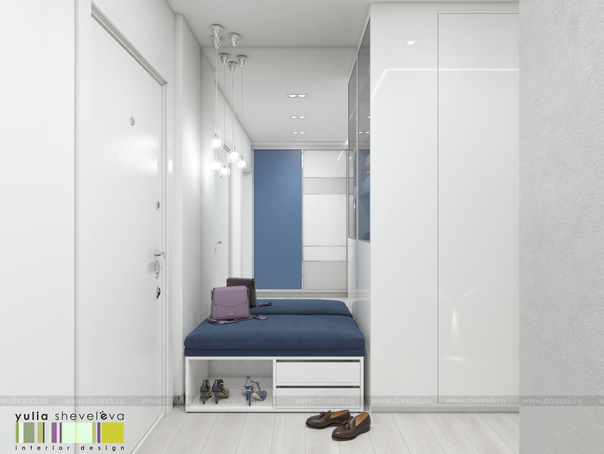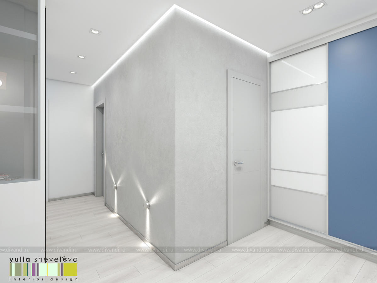 Планировку квартиры было принято решение сильно не менять, лишь гостиная и кухня стали одним общим пространством. Стиль интерьера - легкий и современный, без большого количества декора и деталей. Пастельные голубые и синие тона, светло-серый, белый, различные подсветки - приемы, чтобы создать ощущение открытого пространства и придать воздушности интерьеру.