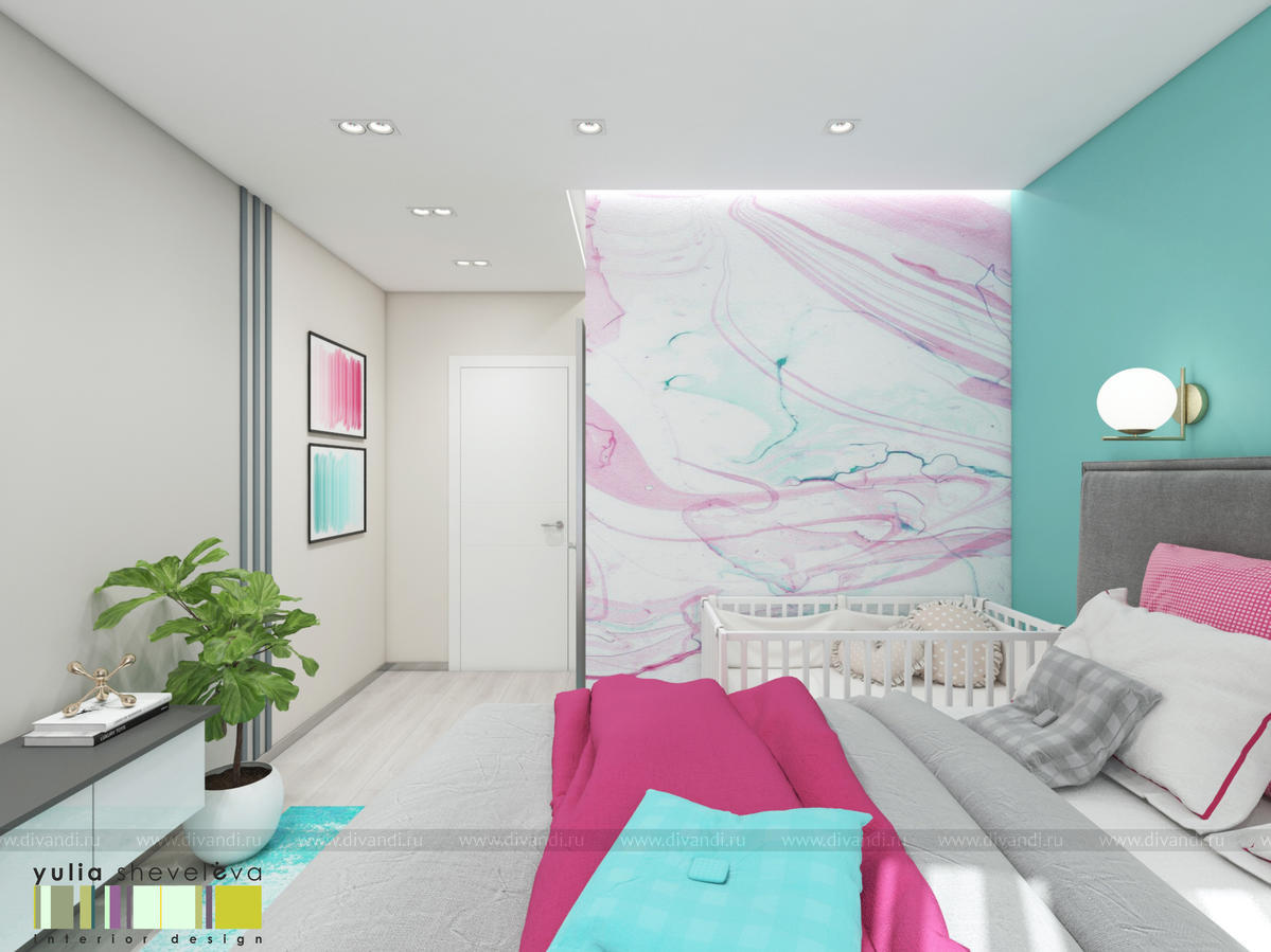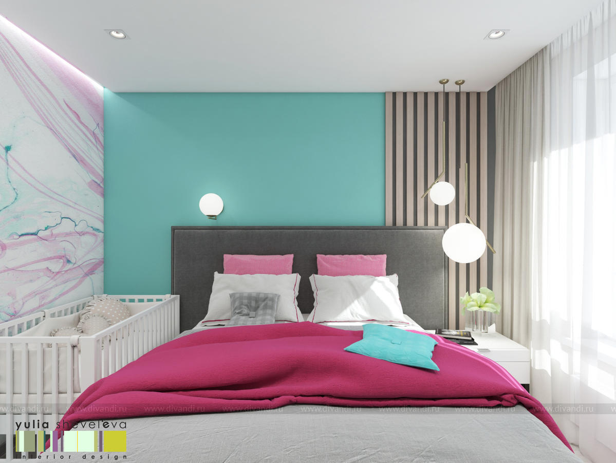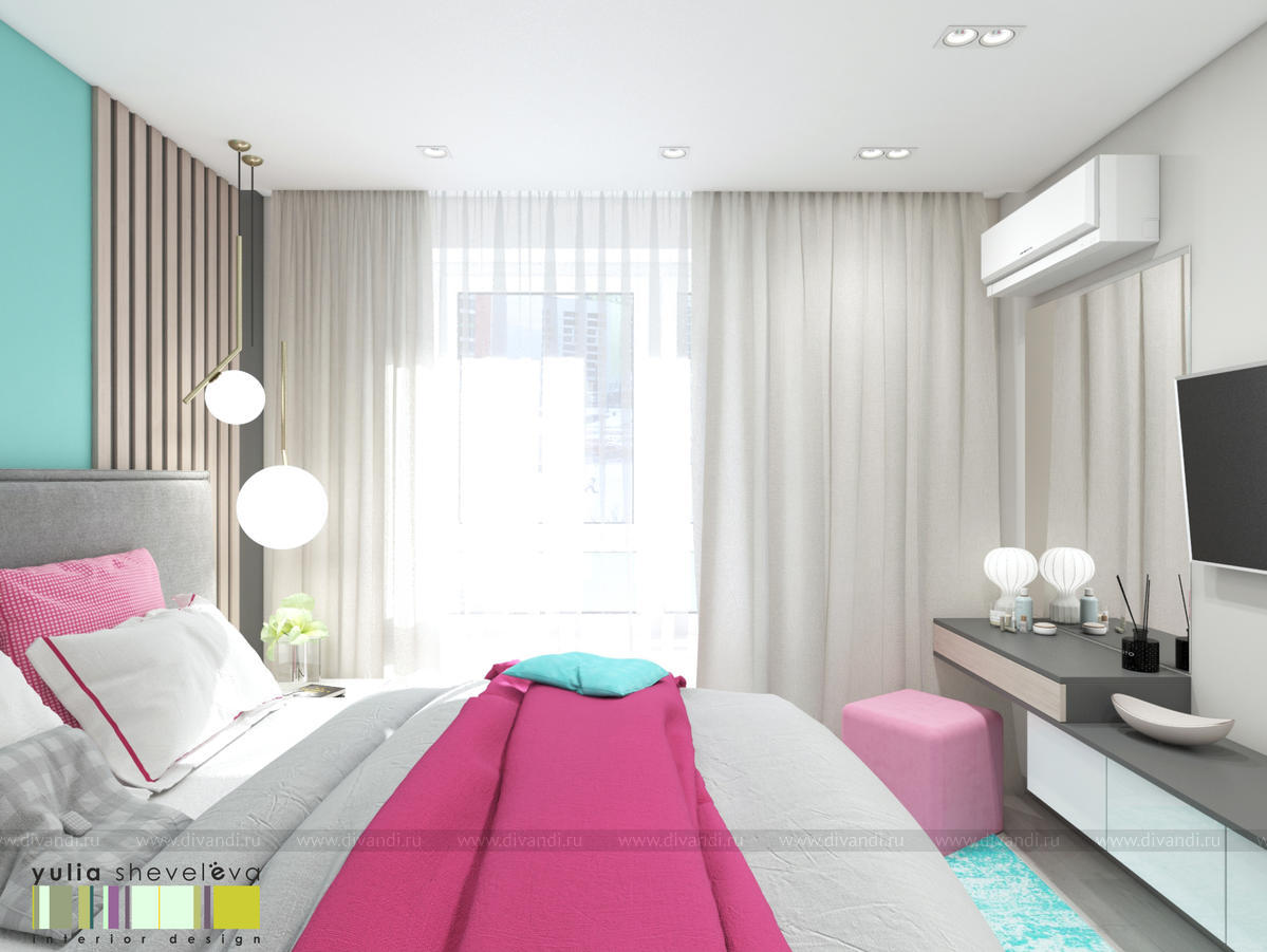 Спальня получилась более яркой и насыщенной по цветам, но тоже во многом за счёт использования текстиля.