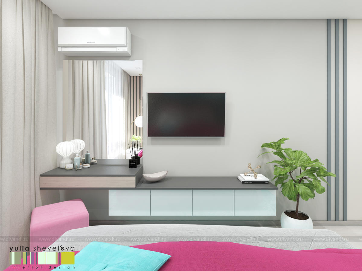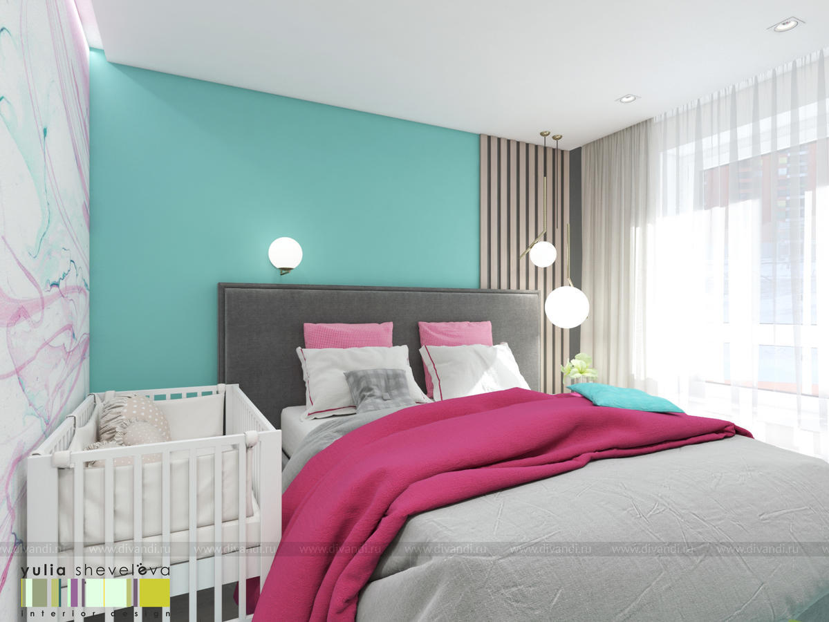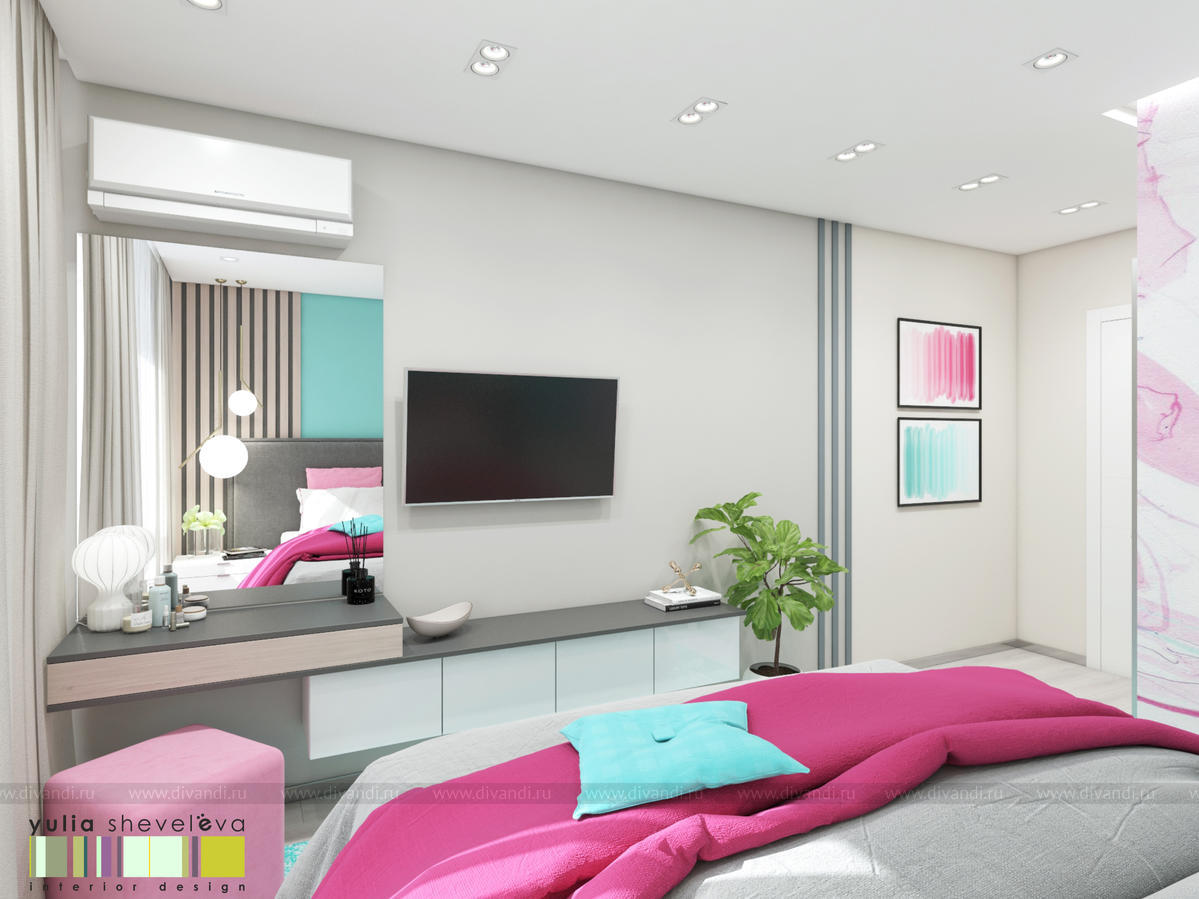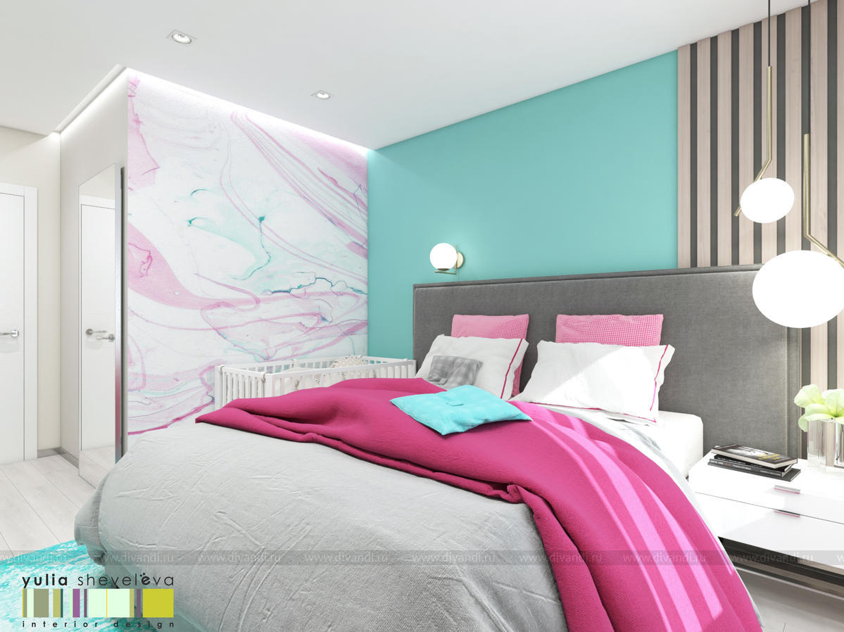 Спальня получилась более яркой и насыщенной по цветам, но тоже во многом за счёт использования текстиля.