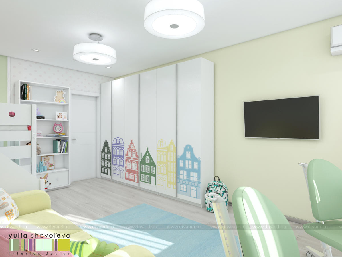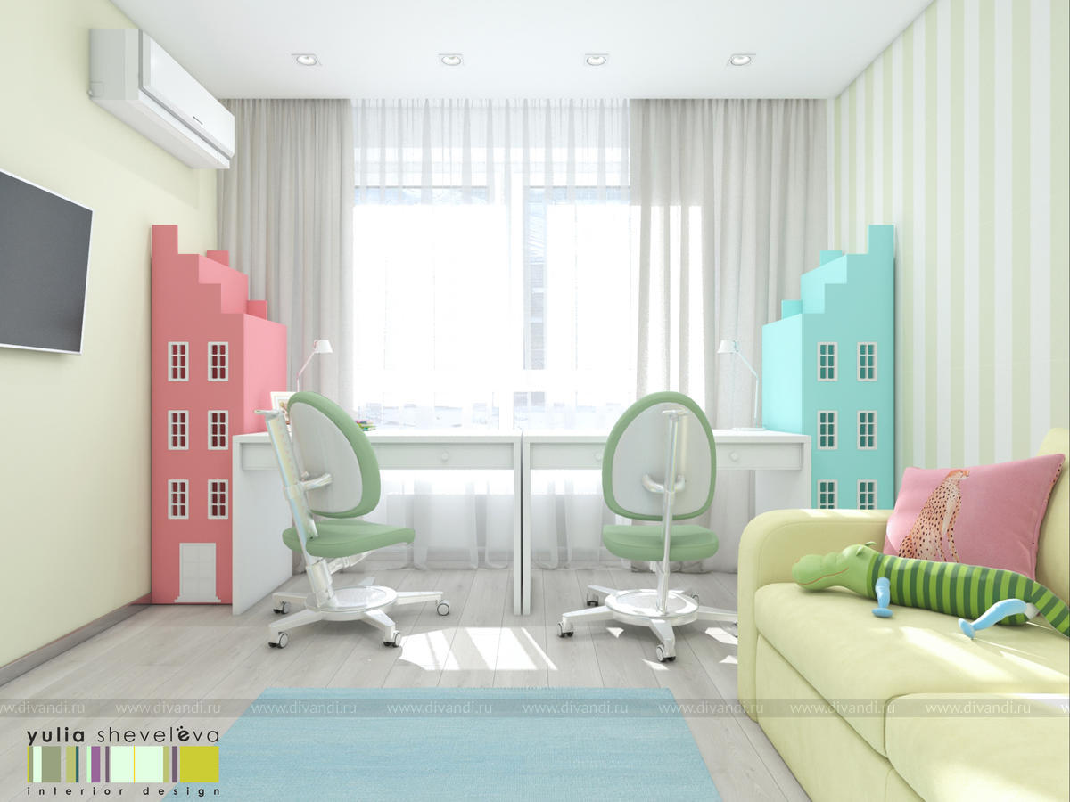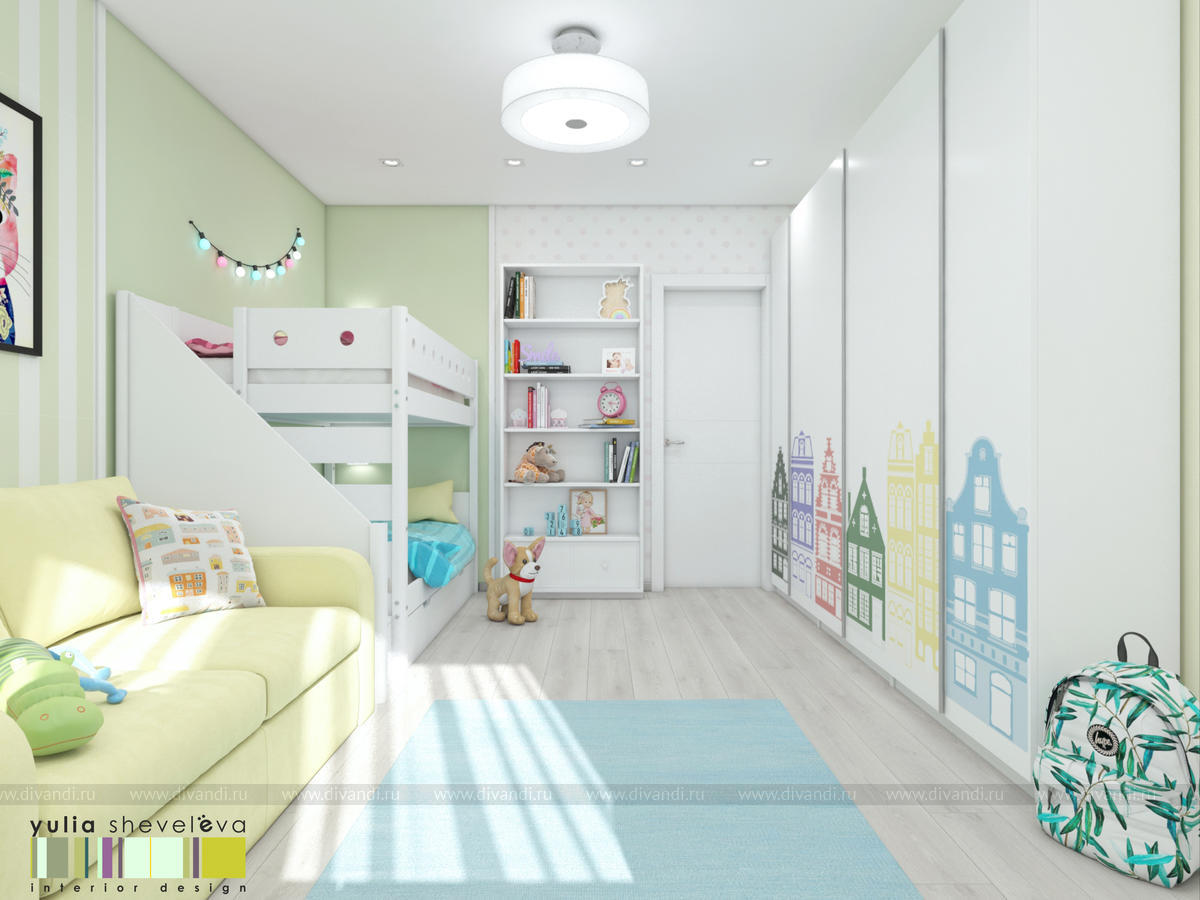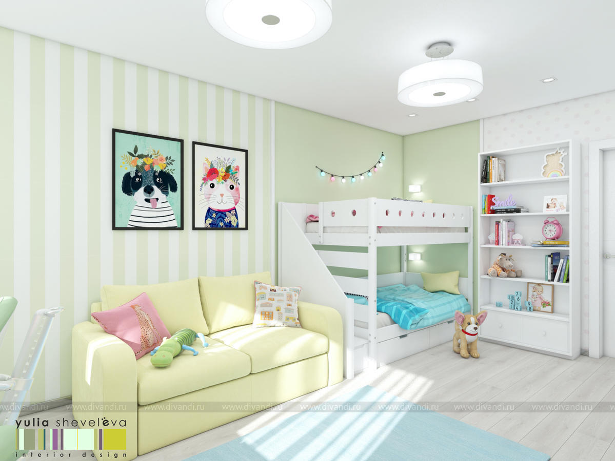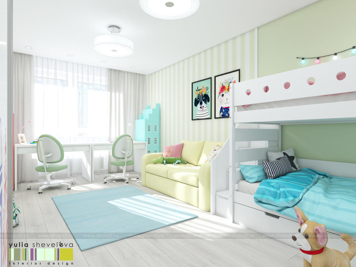 Детская комната для двух малышей - девочки и мальчика. Основная задача - продумать пространство для детей с большой разницей в возрасте, грамотно зонировать пространство, чтобы было удобно и комфортно обоим малышам.