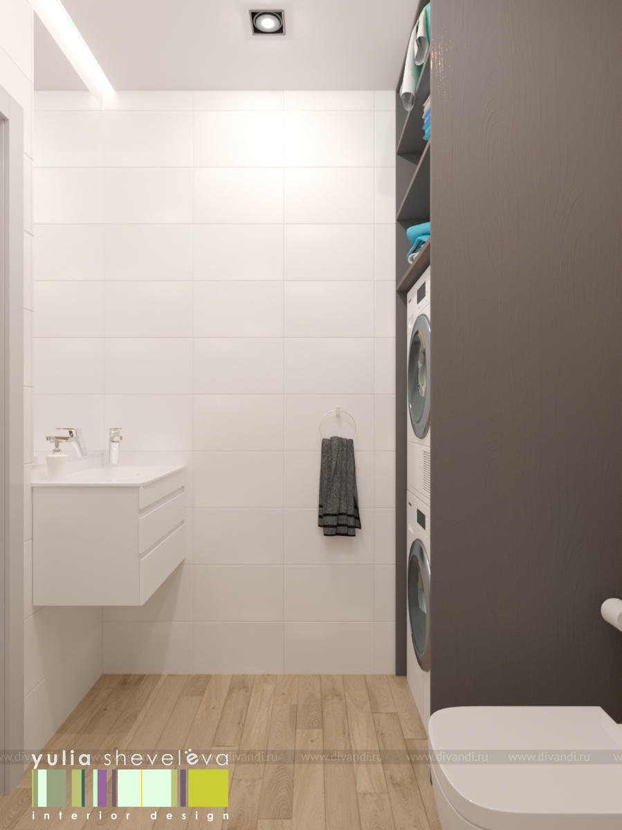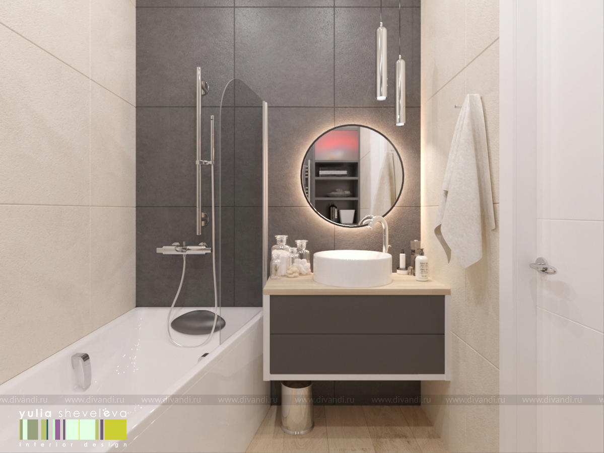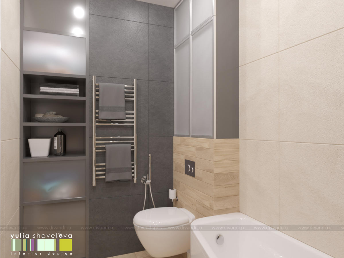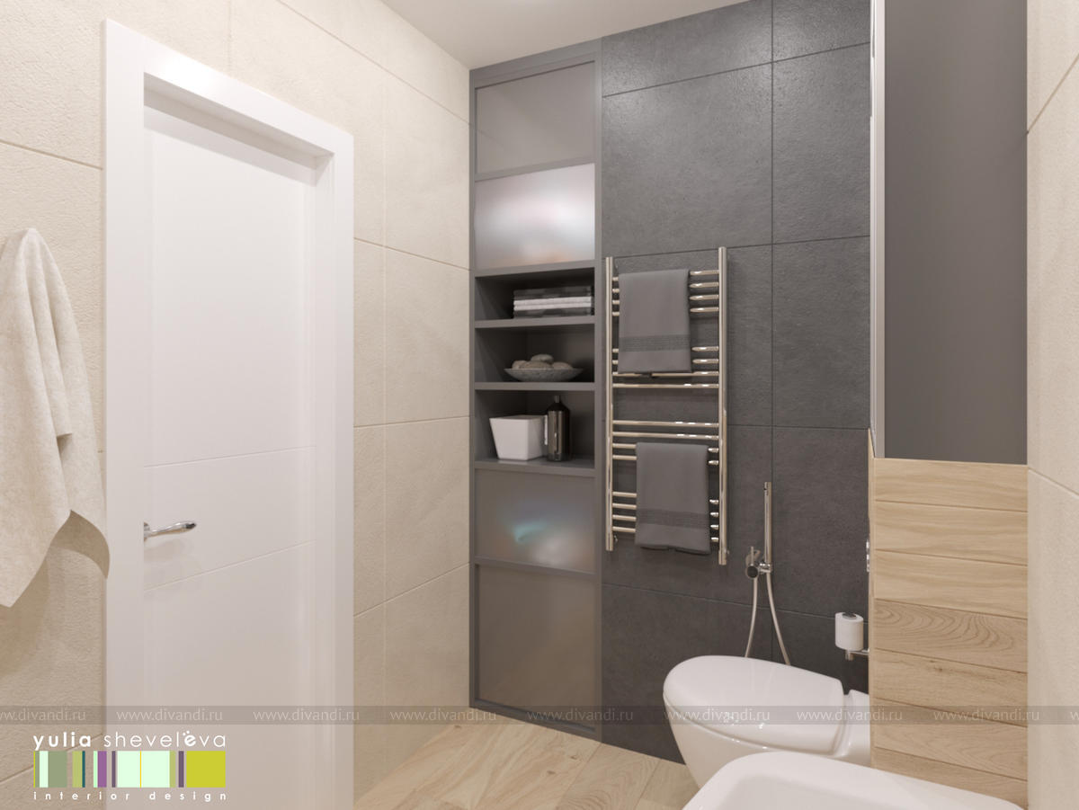 Ванная комната и санузел выполнены в сдержанной бело-серо-черной палитре с небольшими вставками из дерева.