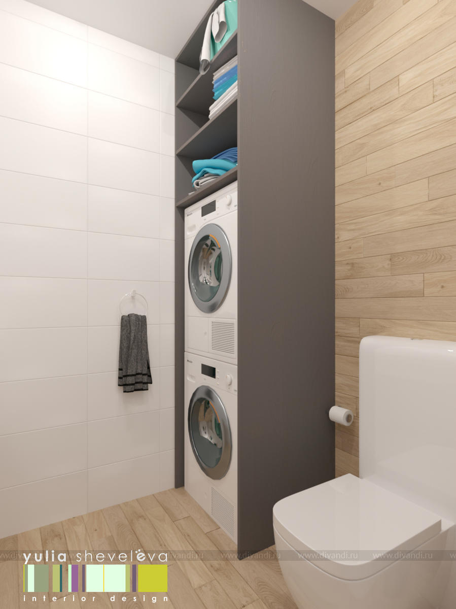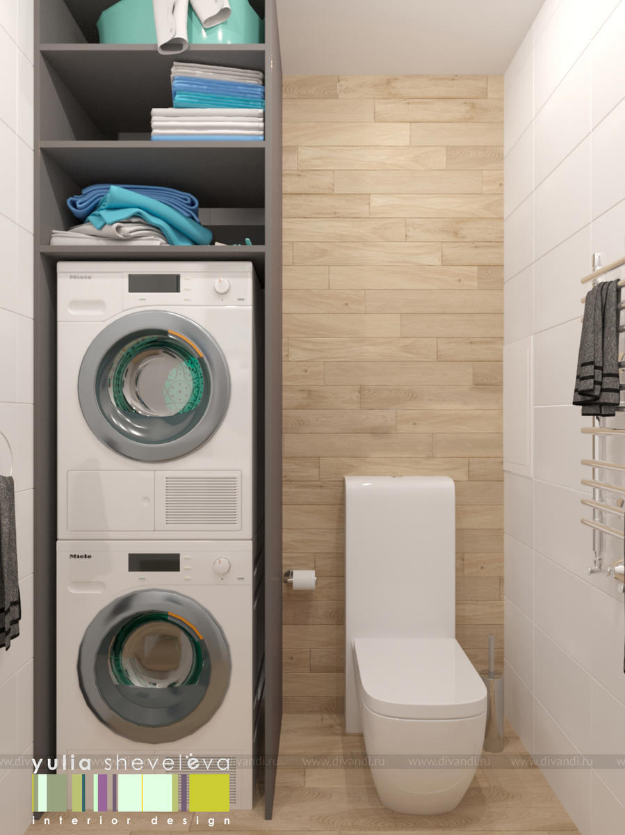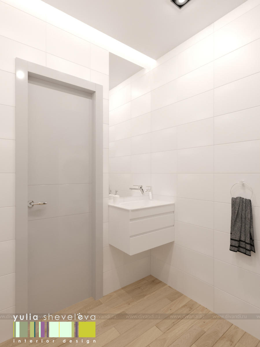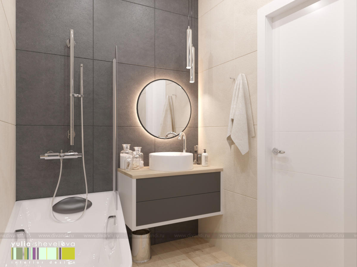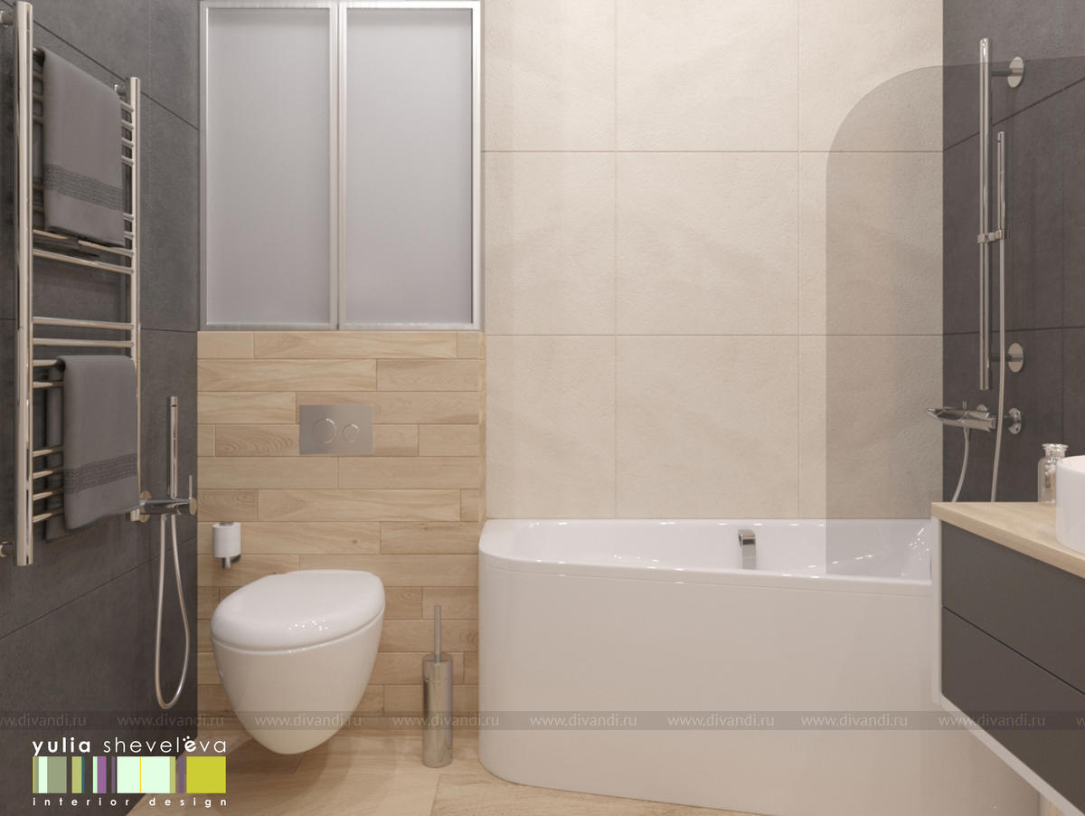 Ванная комната и санузел выполнены в сдержанной бело-серо-черной палитре с небольшими вставками из дерева.