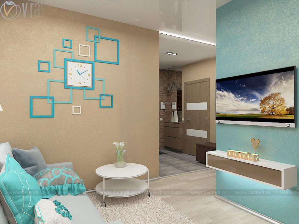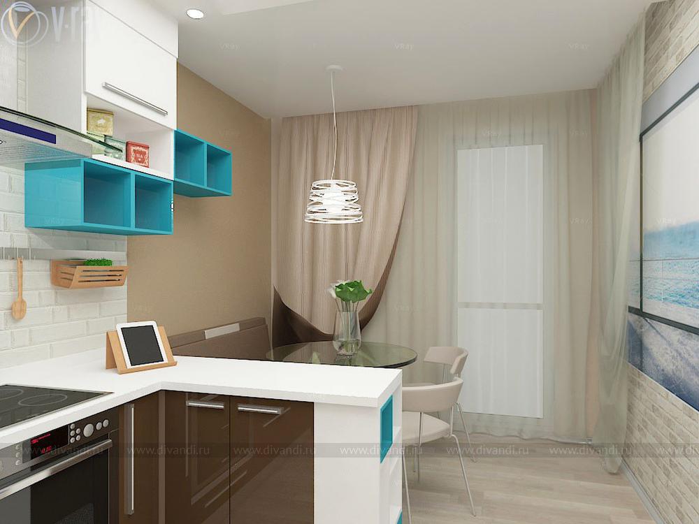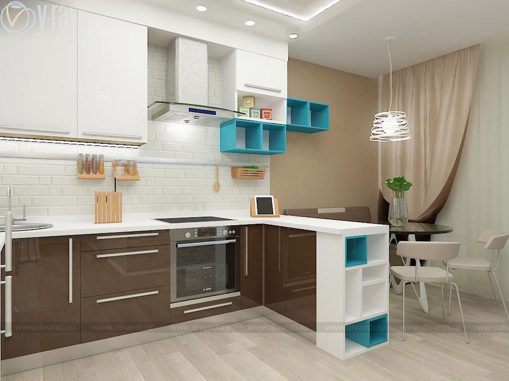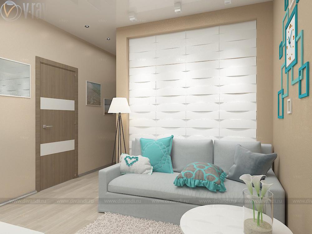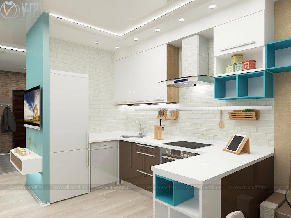 Проект кухни, гостиной, коридора. Интересным решением стало размещение гостиной зоны во втором коридоре благодаря соединению его с частью кухни.