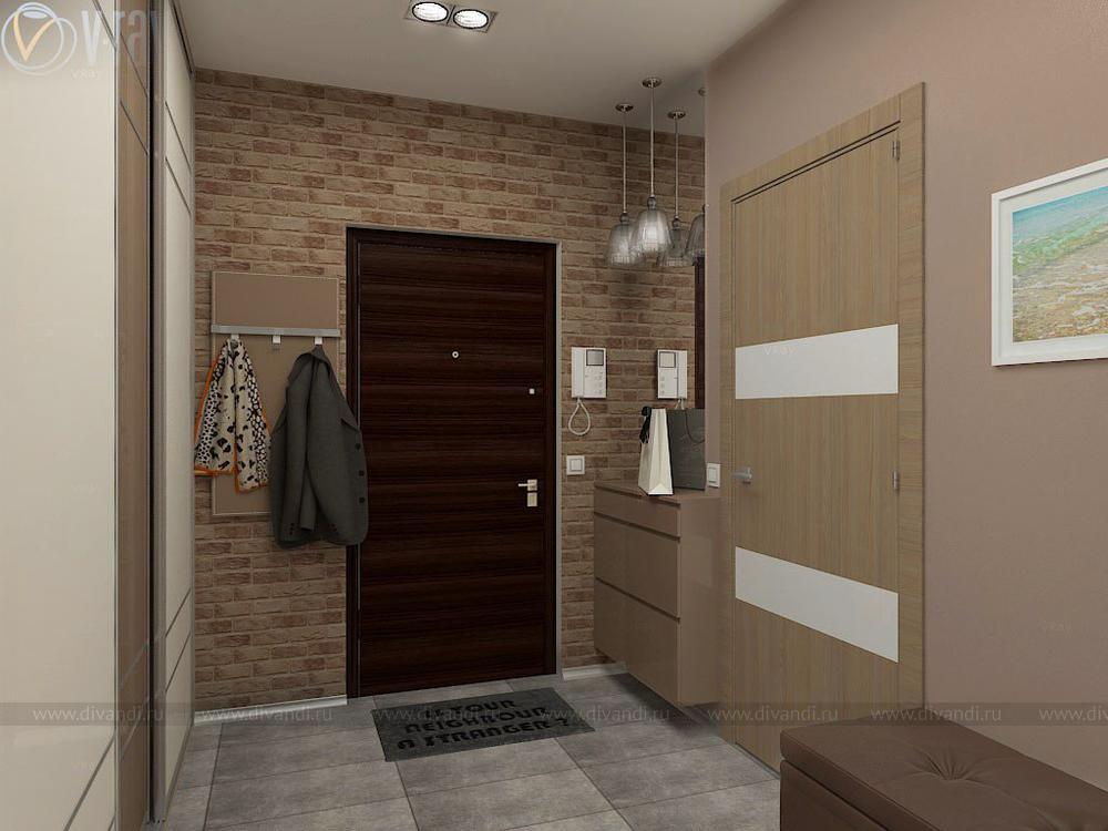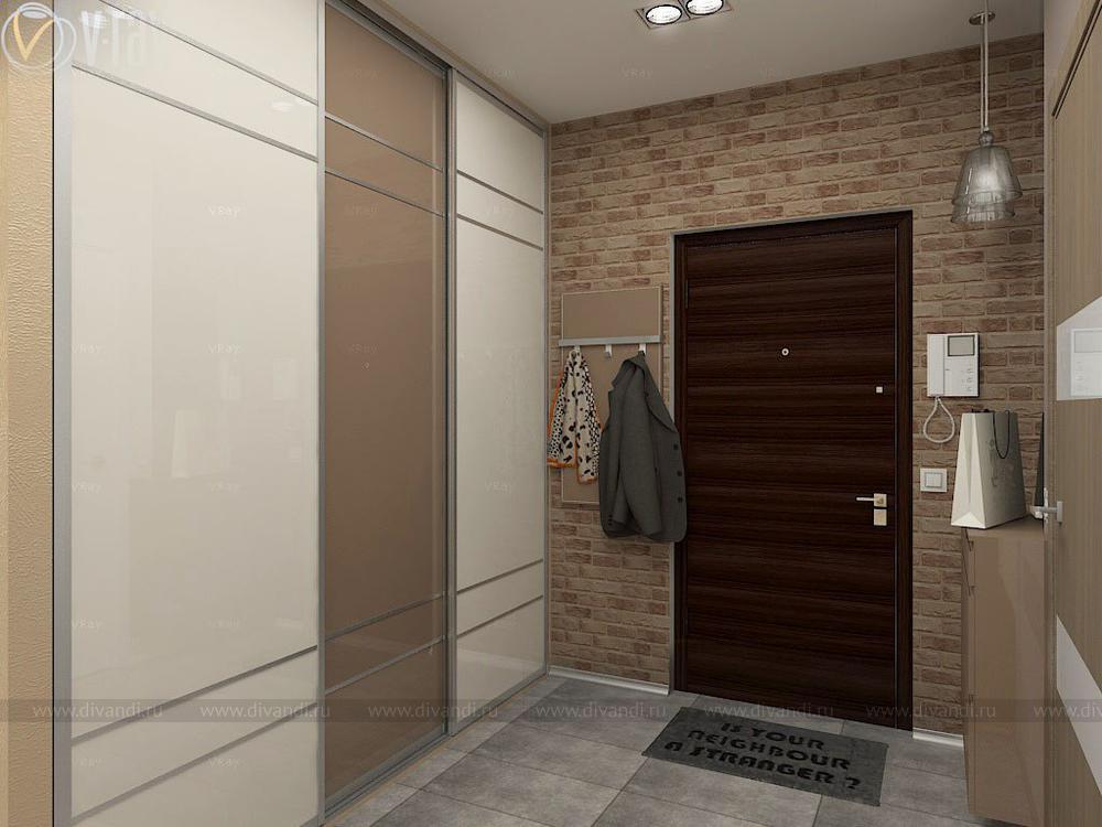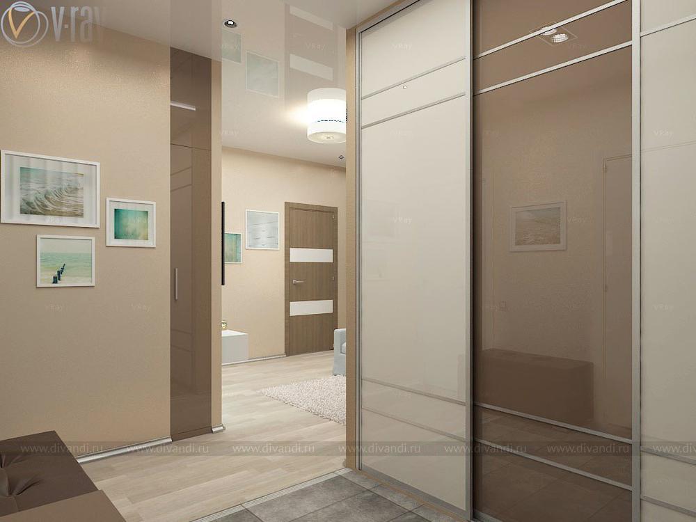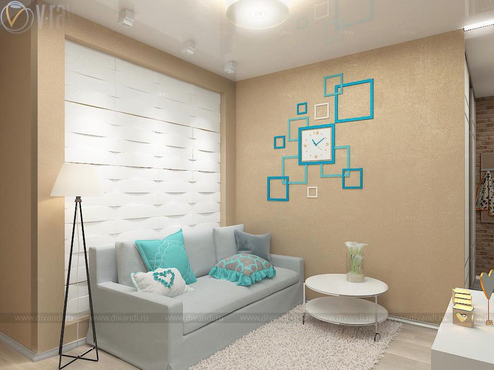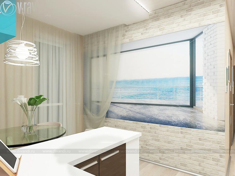 Проект кухни, гостиной, коридора. Интересным решением стало размещение гостиной зоны во втором коридоре благодаря соединению его с частью кухни.