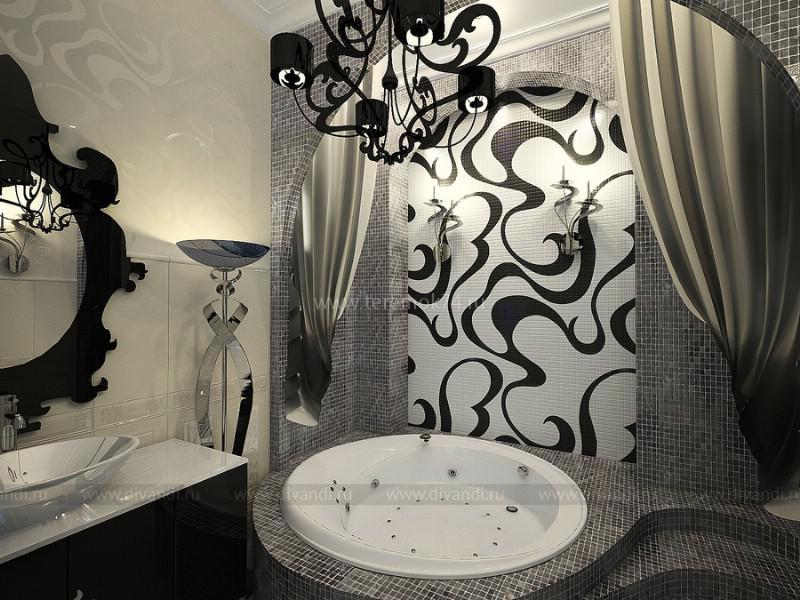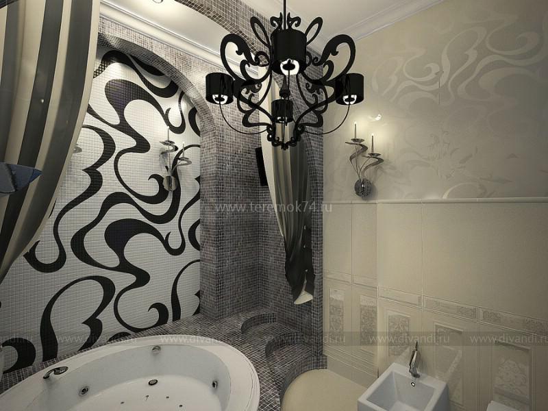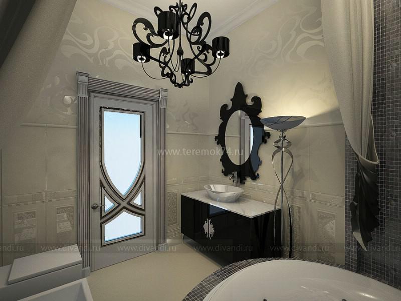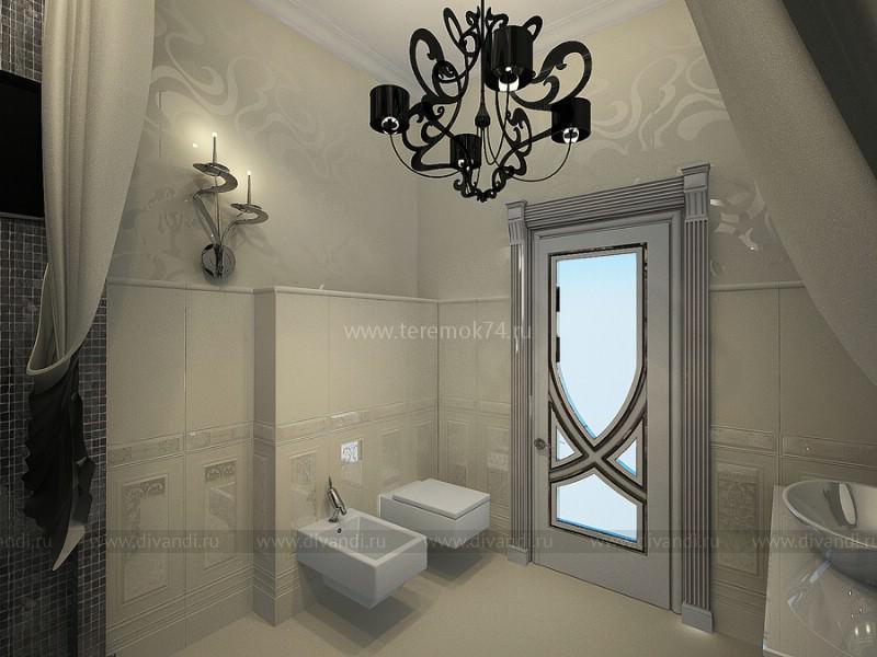 Ар-деко - стиль противоречивый. С одной стороны -роскошь, с другой - практичность. С одной стороны – математический расчет, с другой – изысканный декор. Низ санузла облицован Piemme Valentino, использование материалов из этой коллекции, придется по вкусу как почитателям классического стиля, так и тем, кто хочет быть на пике моды, но не решается на яркие, ультрасовременные интерьеры. Она отлично выступает фоновым решением для роскошной мебели Oasis Hermitage.