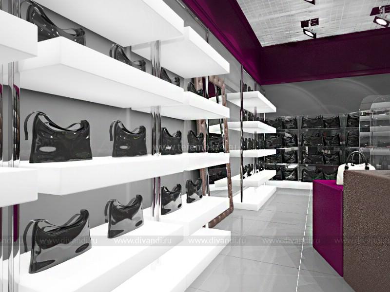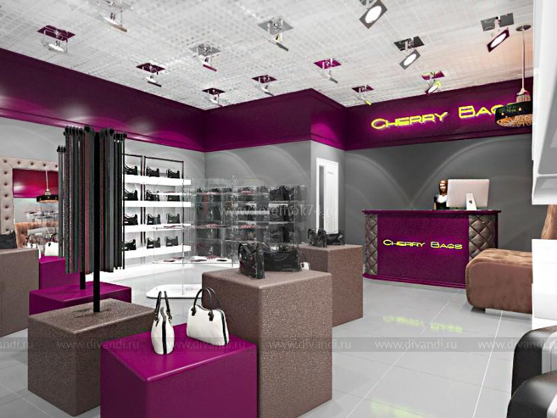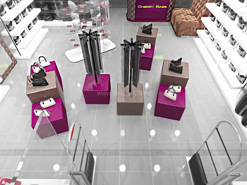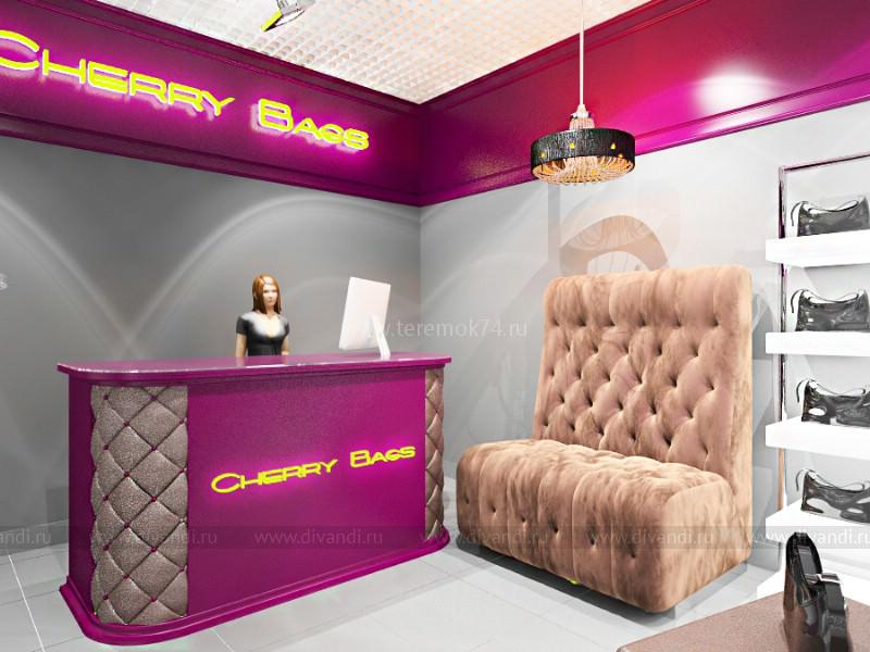 Дизайн магазина «CherryBags» появился из существующего островка, разработанного нашей студий в ТРК «Горки». Торговый зал делится на 3 зоны: женская, мужская, и продажа аксессуаров. Для продажи аксессуаров отведен центр зала, здесь мы разработали специальные конструкции под перчатки, кошельки виде стеклянных витрин, вращающиеся стойки под ремни. На витринах при входе мы разработали лавочки для демонстрации новик чемоданной продукции. Все торговое оборудование разработано и воплощено в жизнь по эскизам нашей студии.