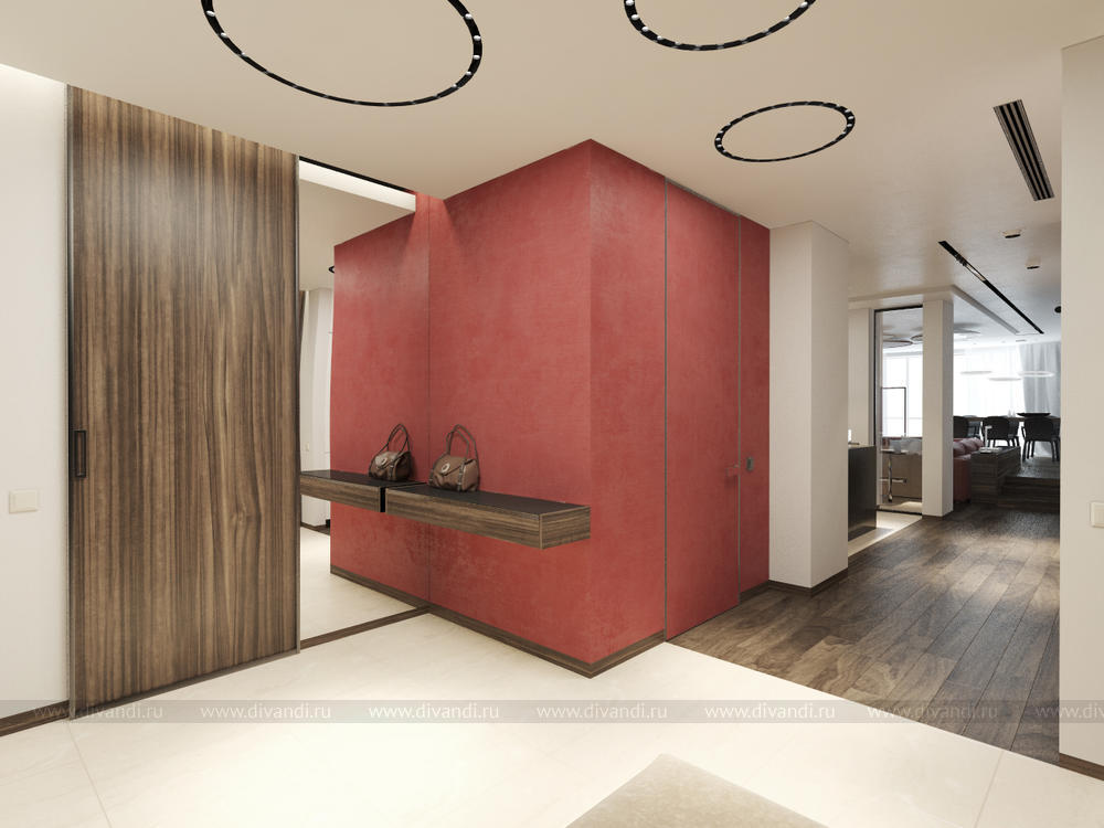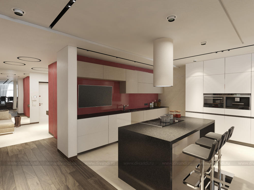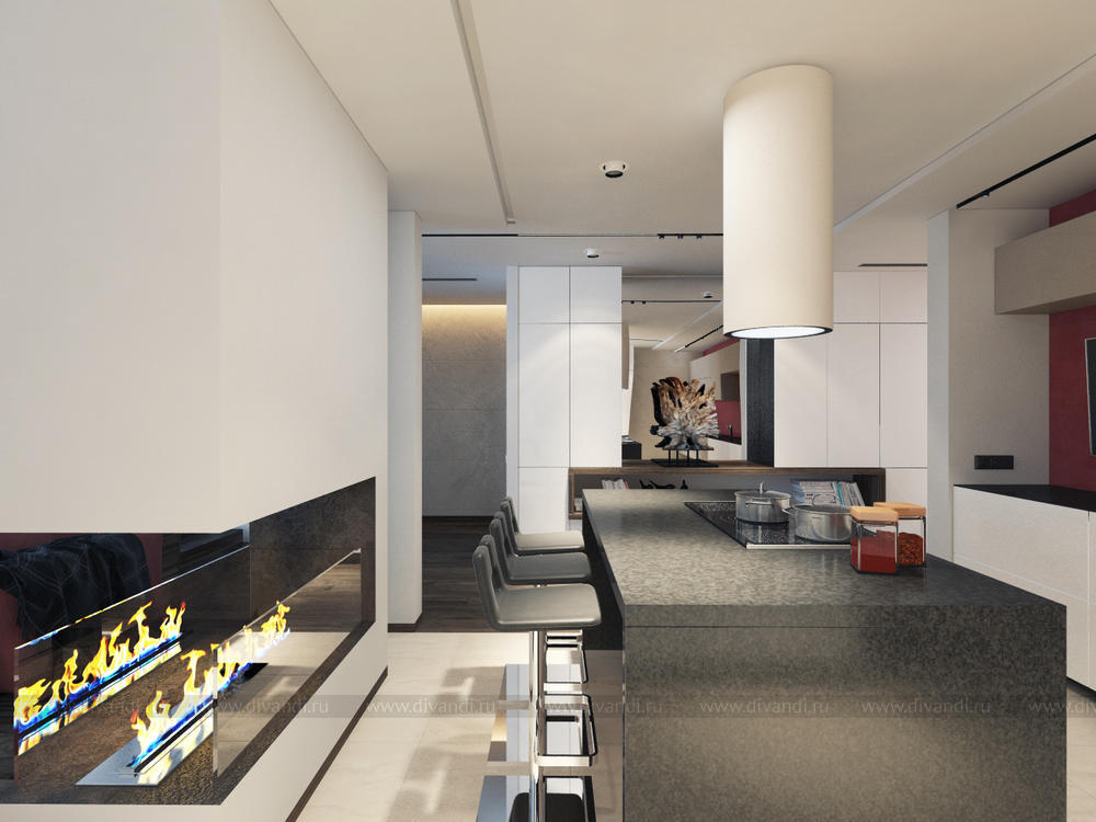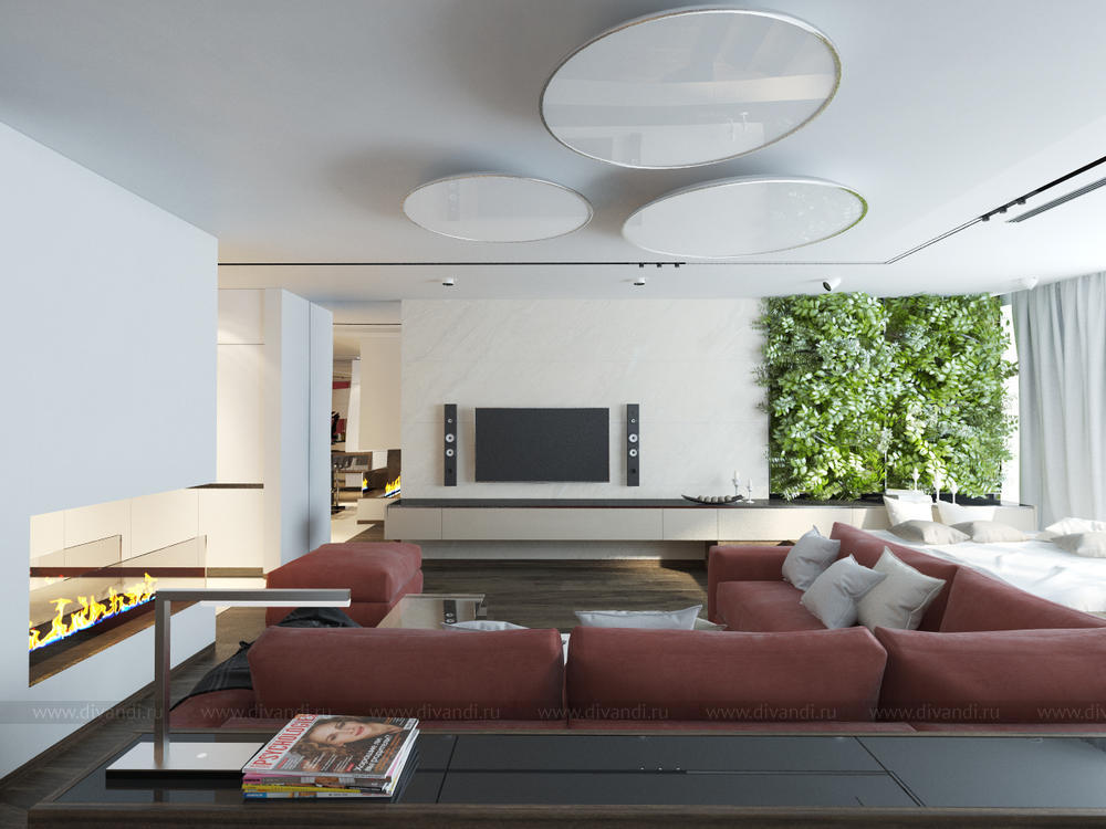 Квартира для молодой пары с ребенком. Интерьер выполнен в современной стилистике. Общее пространство поделено визуально на 2 зоны, роль перегородки в этом случае служит камин, который видно с двух сторон и с зоны кухни и с зоны гостиной. В прихожей на потолке нашли себе место световые круги, в гостиной так же поддержана тема кругов на потолке. Так как в гостиной цельное остекление был оборудован подиум с встроенной лежанкой в нем, чтоб наслаждаться видами с птичьего полета на город и на зеленую рощу у дома. Изюминкой в гостиной служит вертикальное озеленение, натуральными цветами возле лежанки. Спальня объедена с ванной и гардеробной в один блок. Чтоб пространство смотрелось большим, ванную от спальни отделили стеклянной перегородкой. Помещение детской так же разделили на две зоны, это зона для игр и для отдыха. Полностью проект можно смотреть на сайте http://starikovaolga.blogspot.ru/2015/05/blog-post.html