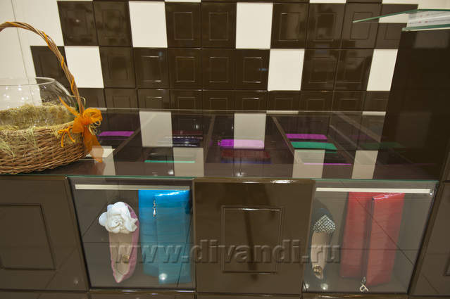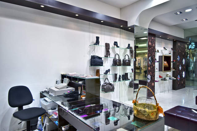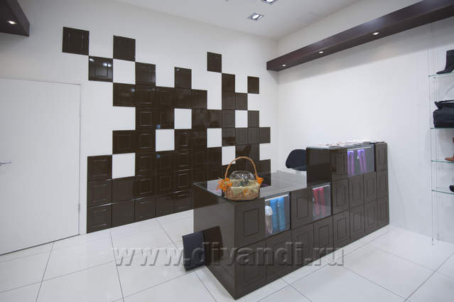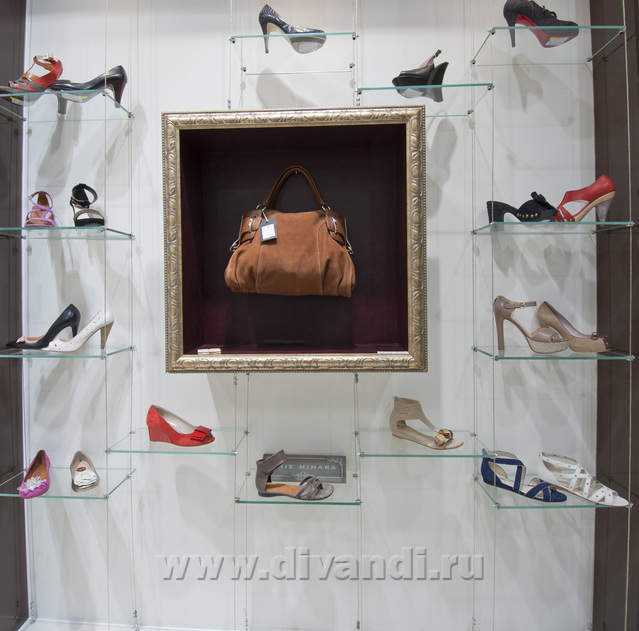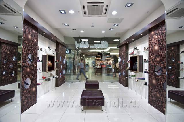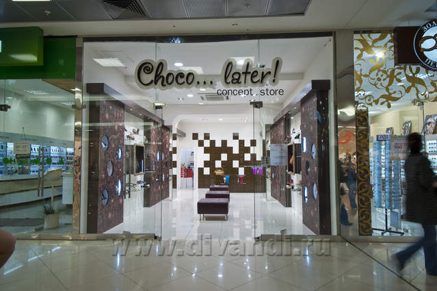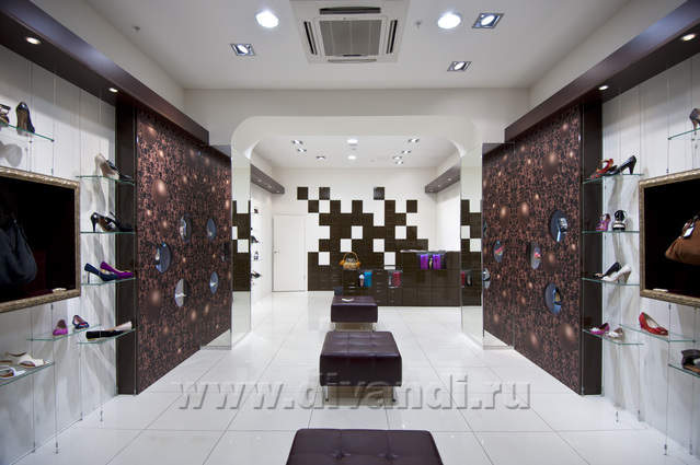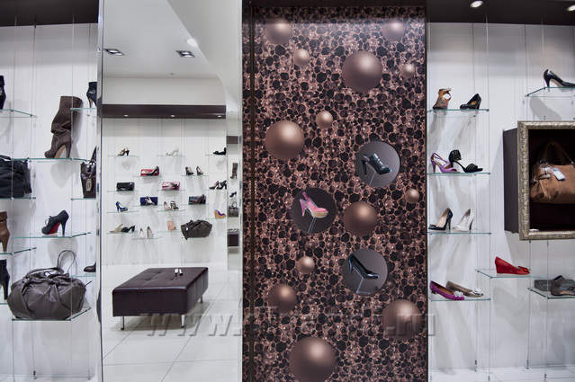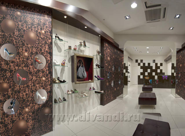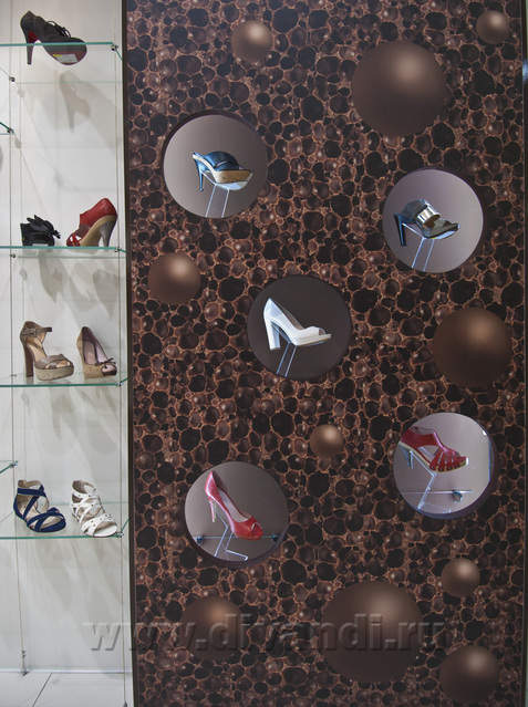 Витрины для экспозиции модной обуви представляют из себя разрез кусочка пористого шоколада. Каждый воздушный пузырёк является ячейкой для демонстрации стильной обуви. Способ экспозиции сумок и аксессуаров построен на принципе фигура — фон, где аксессуар или сумка окружены фоном из шоколадного бархата, обрамлённого в позолоченный багет. Рабочее место продавца-администратора собрано из множества маленьких шоколадок.