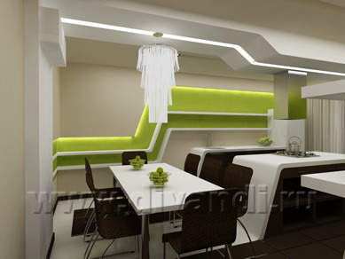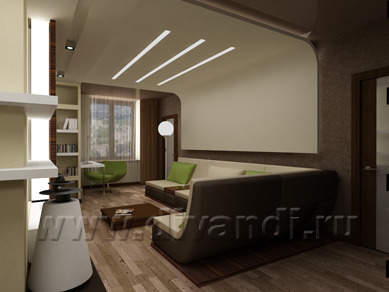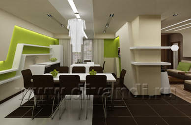 Такие, в общем-то, сугубо человеческие качества, как новаторство и динамизм, хорошо прослеживаются в интерьере. Они переданы при помощи таких архитектурных средств, как: разноплановость фактур и освещения, сочетание контрастных и нюансных оттенков цветов, предельная лаконичность форм и простота композиции. Получилось очень эмоционально и свежо. Пространство не традиционно «перетекает», а скорее как бы двигается. Игра плоскостей потолка и стен, блестящих поверхностей с природными фактурами, сочетание не сочетаемых брутальных, почти технических, и ажурных, напоминающих классический хрусталь, светильников, рождает массу эмоций и ассоциаций.