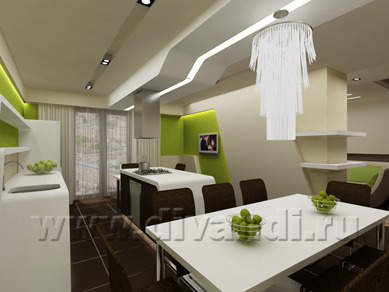 Обязательным условием при проектировании интерьера было создание отдельного помещения - спальни для хозяев. В остальном же не было никаких ограничений для творчества дизайнеров. В результате получилось единое перетекающее пространство, включающее кухню, столовую, гостиную. При этом каждая из зон обладает необходимой степенью автономности.
