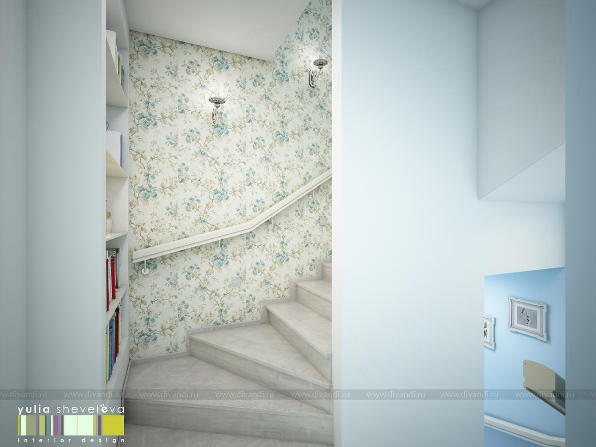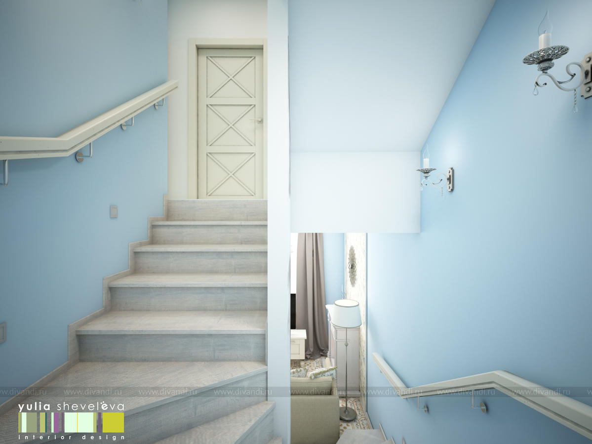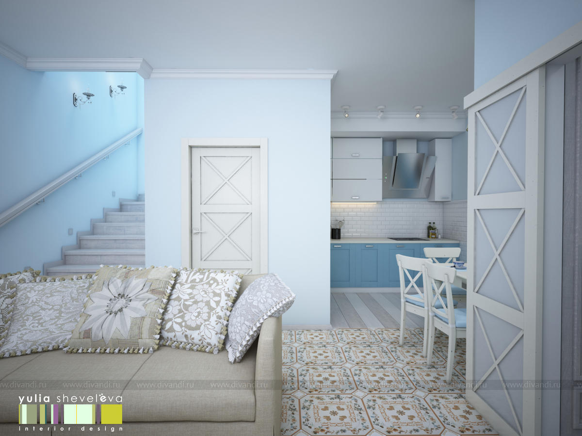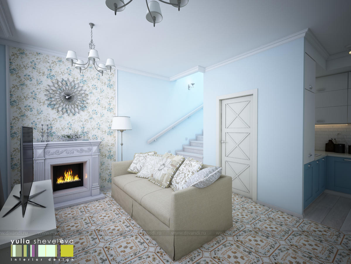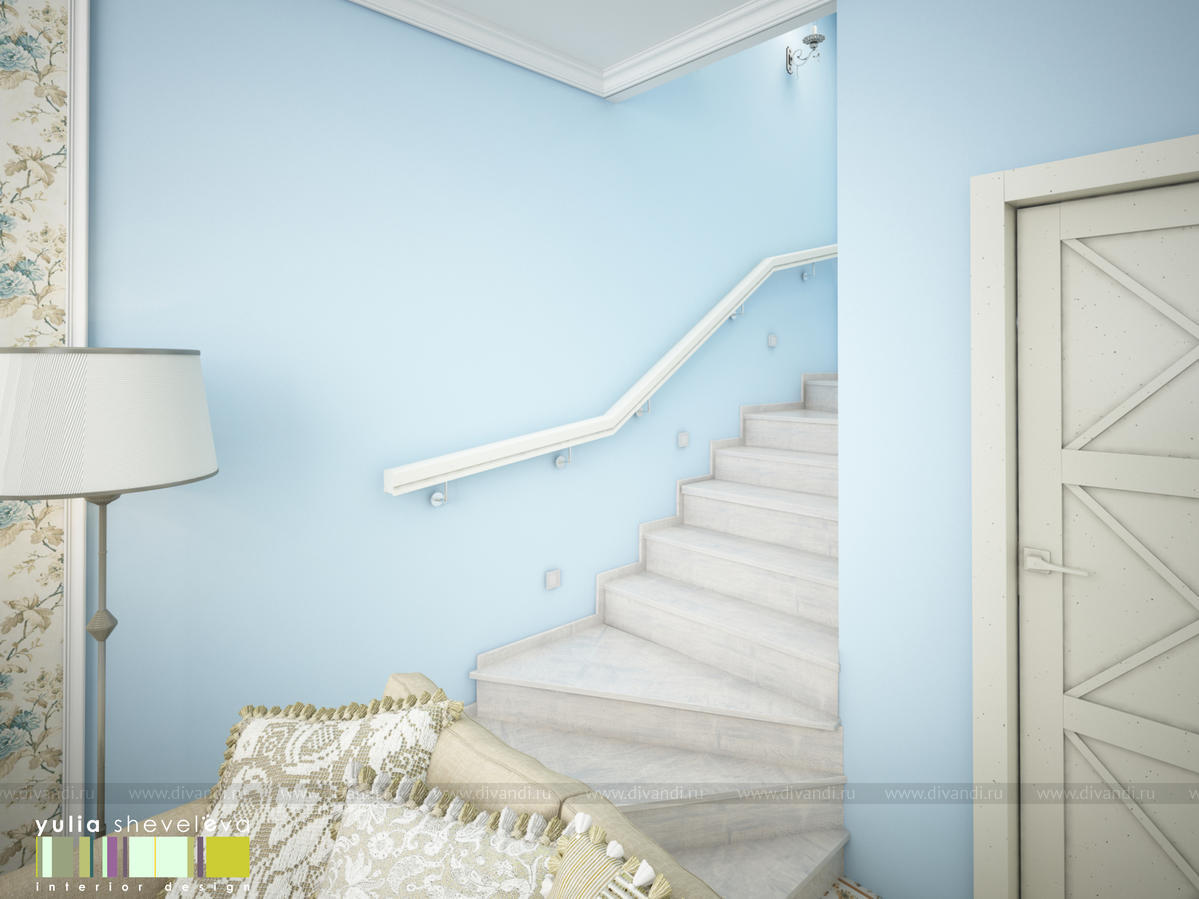 Проект небольшого таунхауса было решено проектировать в стиле прованс. На трех этажах пространства расположились кухня гостиная, спальня и кабинет и две детские зоны.