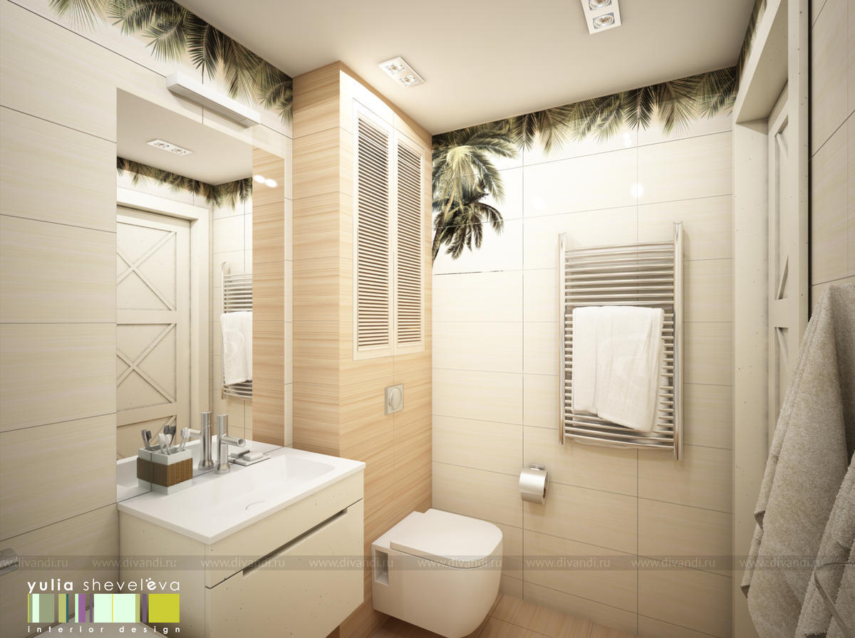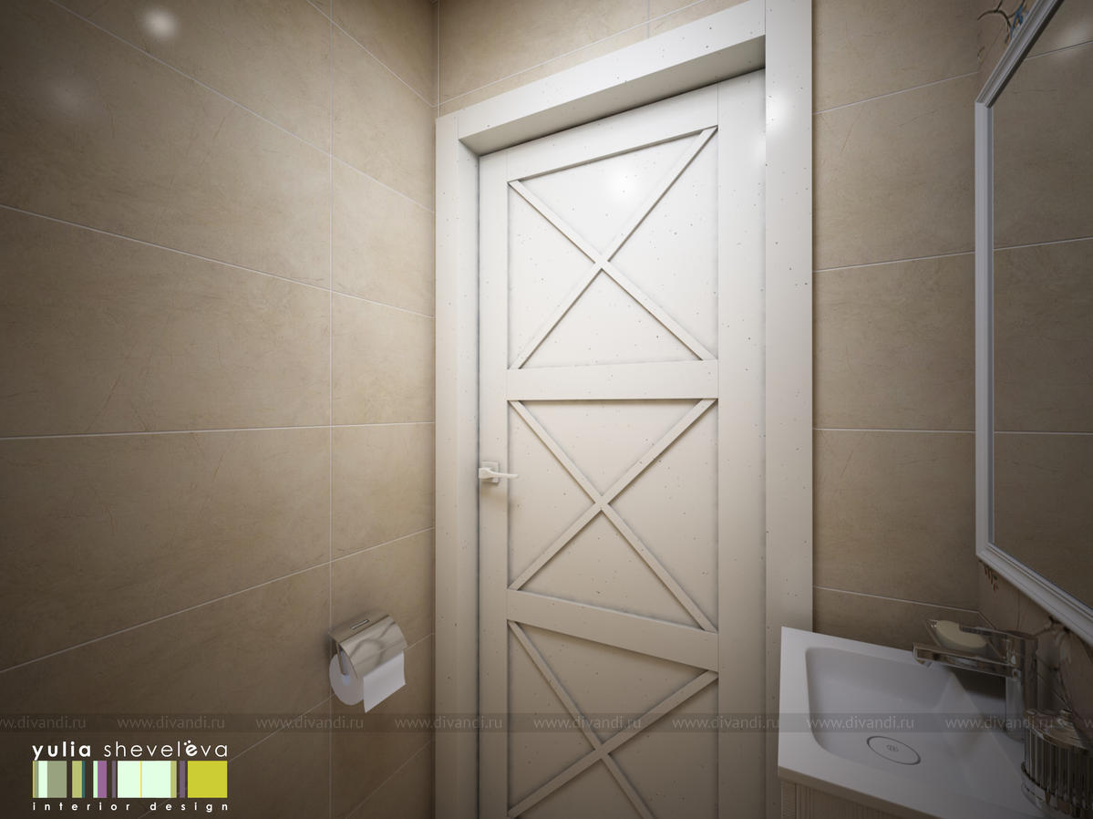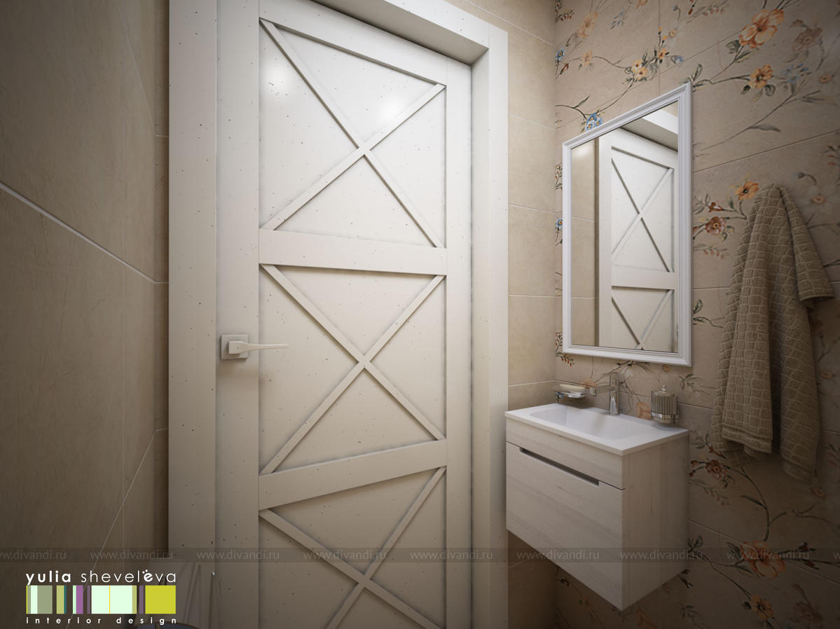 Под лестничным пространством на первом этаже предусмотрен небольшой санузел. При проектировании лестницы и конструировании потолка тщательно просчитывался уровень опуска конструкции из гипсокартона, так как глава семьи очень высокого роста и важно, чтобы ему было удобно пользоваться санузлом.