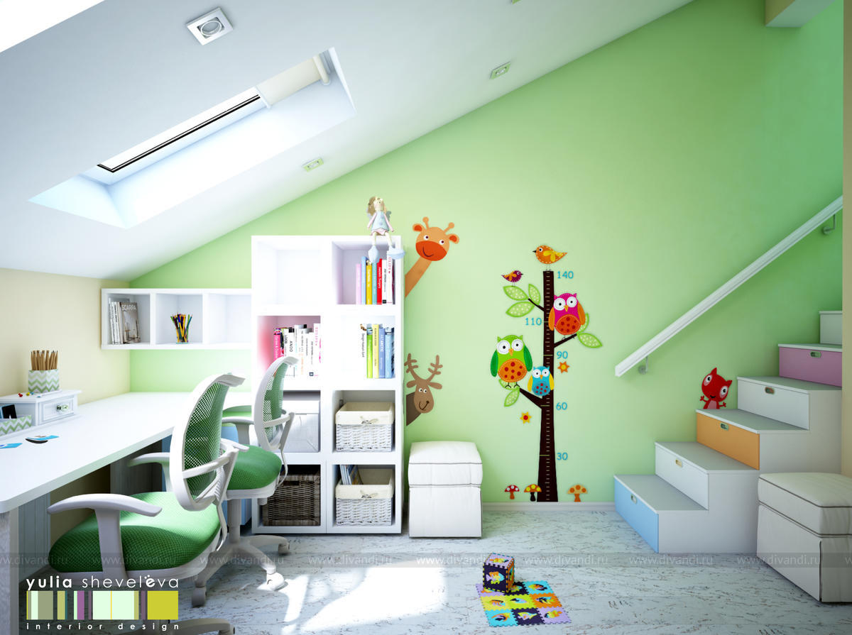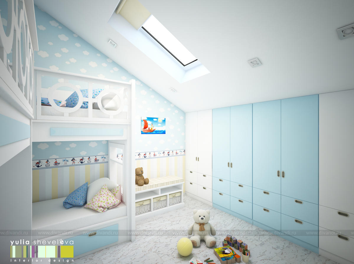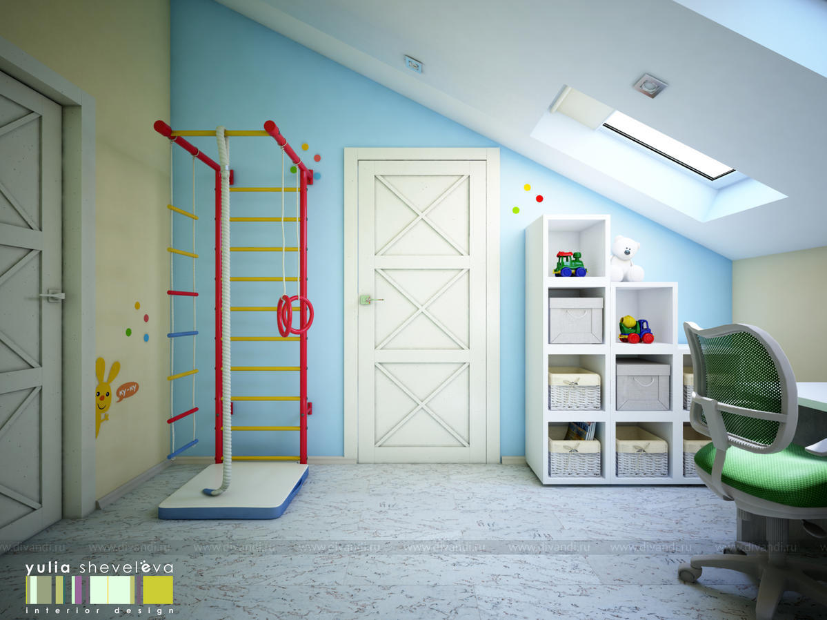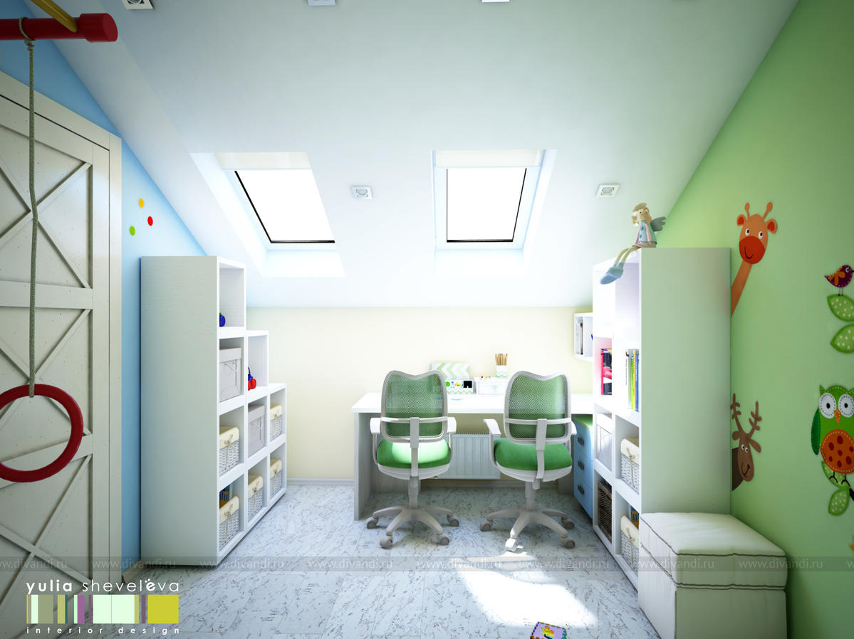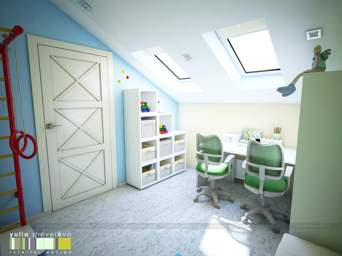 На верхнем уровне расположились две детские комнаты. Пространство предназначено для четверых малышей. Одна комната была отведена под спальную зону, вторая-под игровую и место для занятий. Из игровой также сделан небольшой лаз на подкровельное пространство, где организовали детский "штаб".
