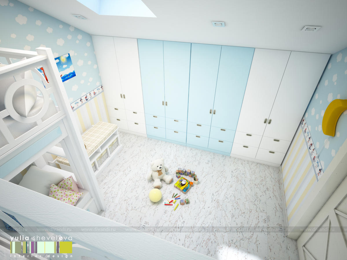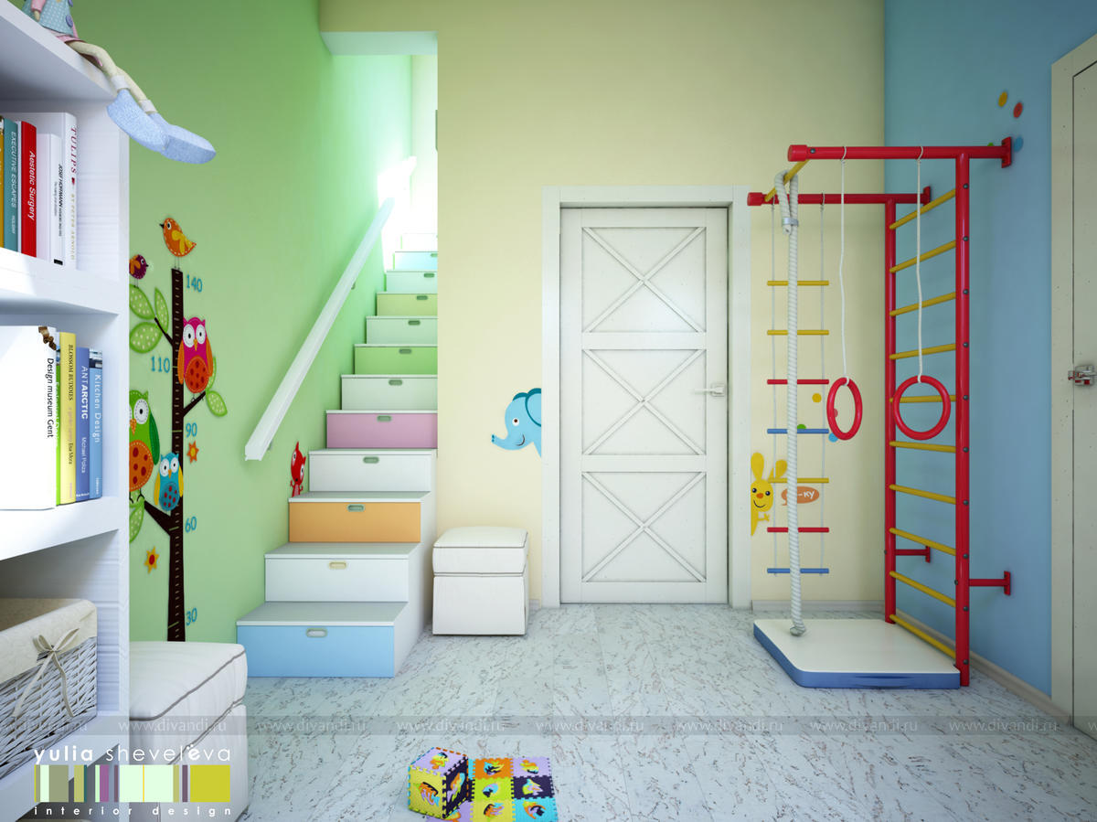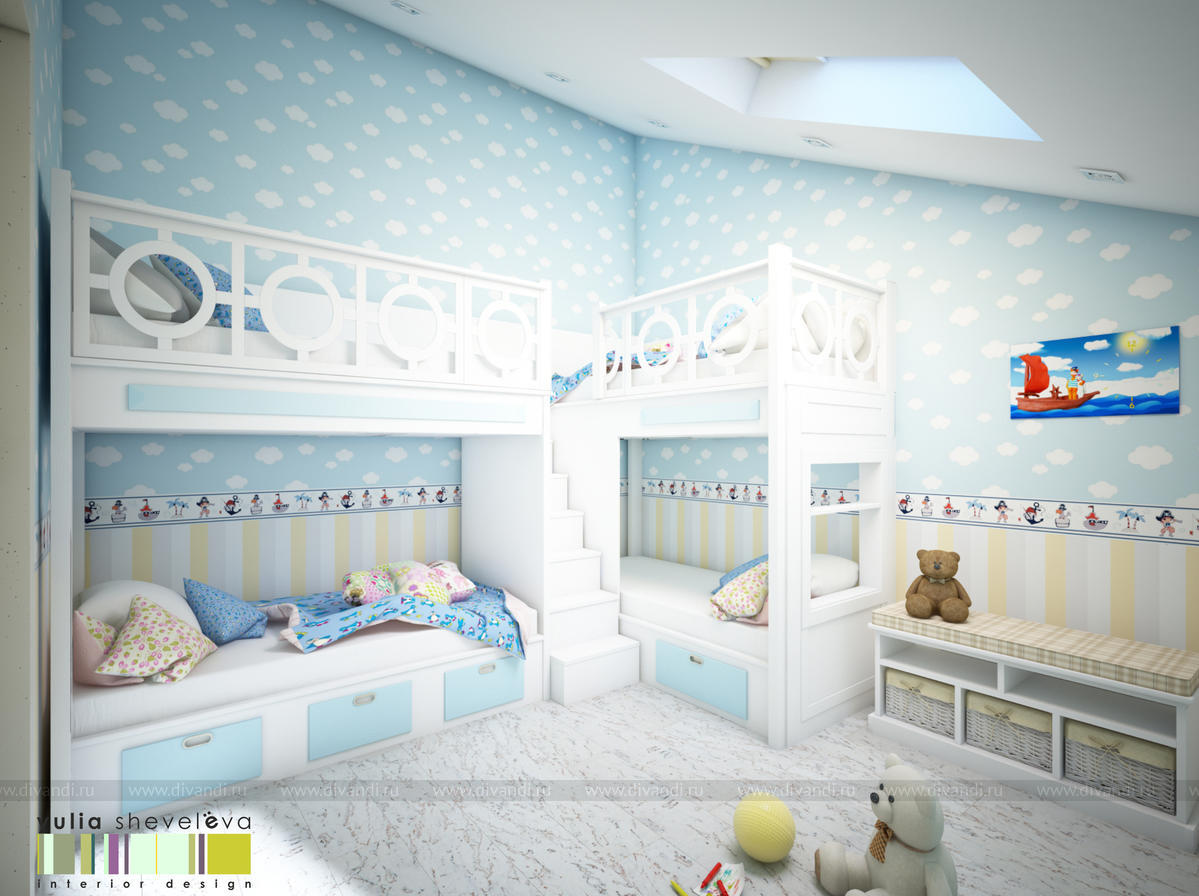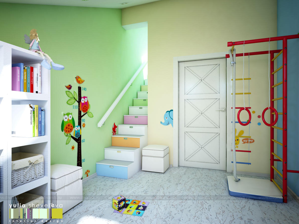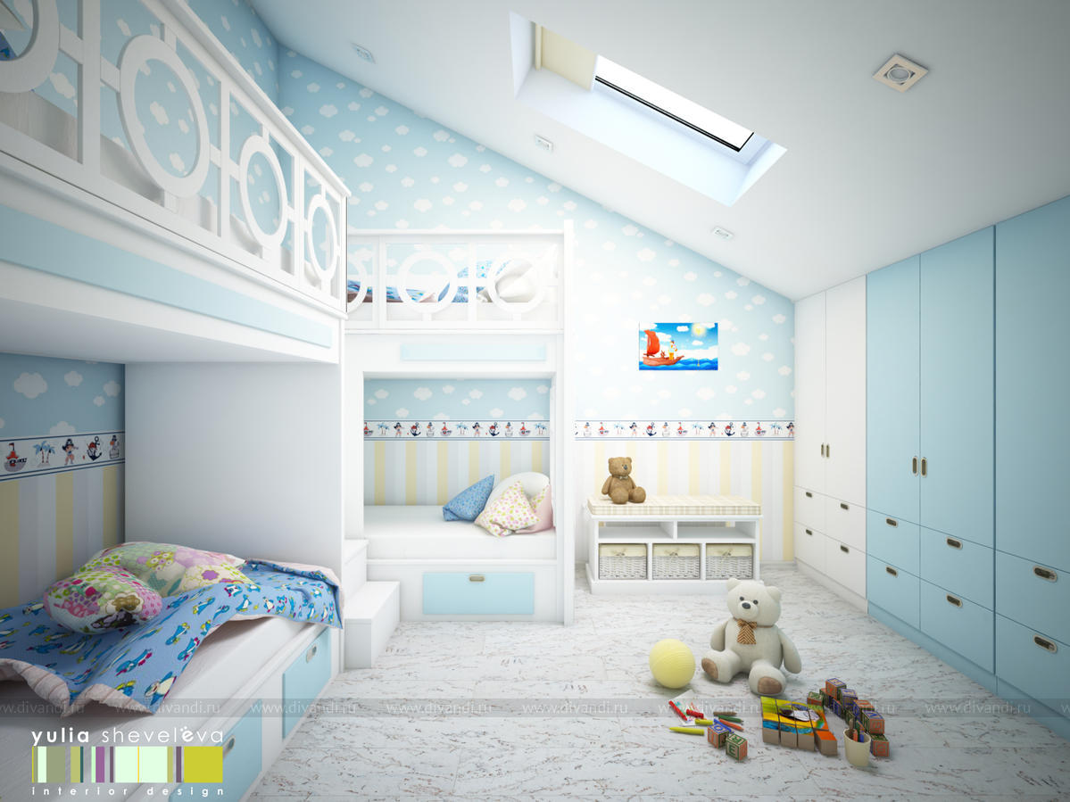 На верхнем уровне расположились две детские комнаты. Пространство предназначено для четверых малышей. Одна комната была отведена под спальную зону, вторая-под игровую и место для занятий. Из игровой также сделан небольшой лаз на подкровельное пространство, где организовали детский "штаб".
