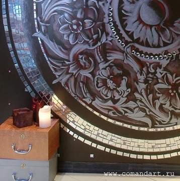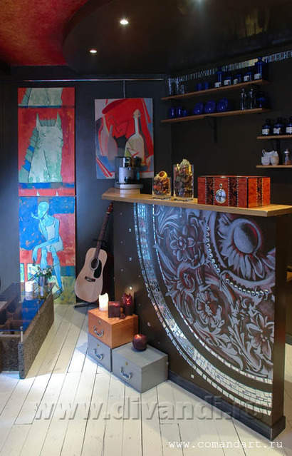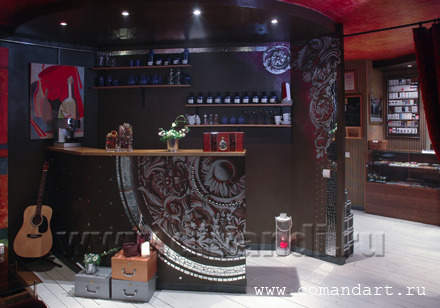 В оформлении пространства магазина примененo несколько техник декорирования. Барную стойку и стену за ней украшает фрагмент классического орнамента. Декор создан с помощью художественной росписи, зеркальной мозаики и страз. Часть потолка покрыта декоративной штукатуркой. Довершением образа интерьера стала экспозиция картин.