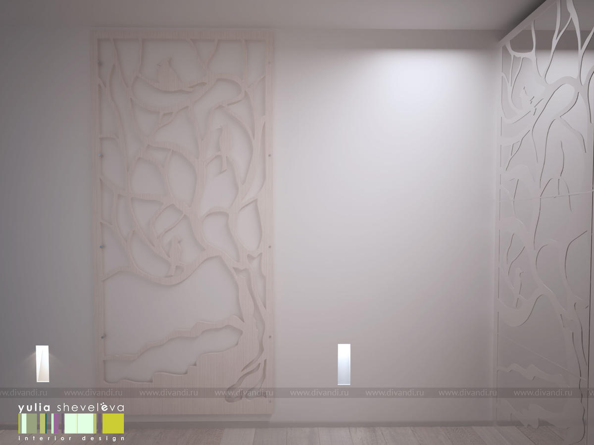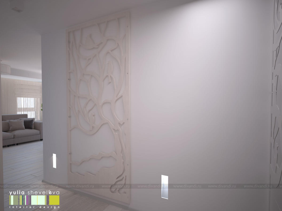 Тема природы и натуральных материалов начинает свое движение от входа в квартиру, с просторного холла, где расположено стилизованное изображение дерева. В совмещенной гостиной-кухни на видовой зоне в качестве декора использован рисунок годовых колец дерева.