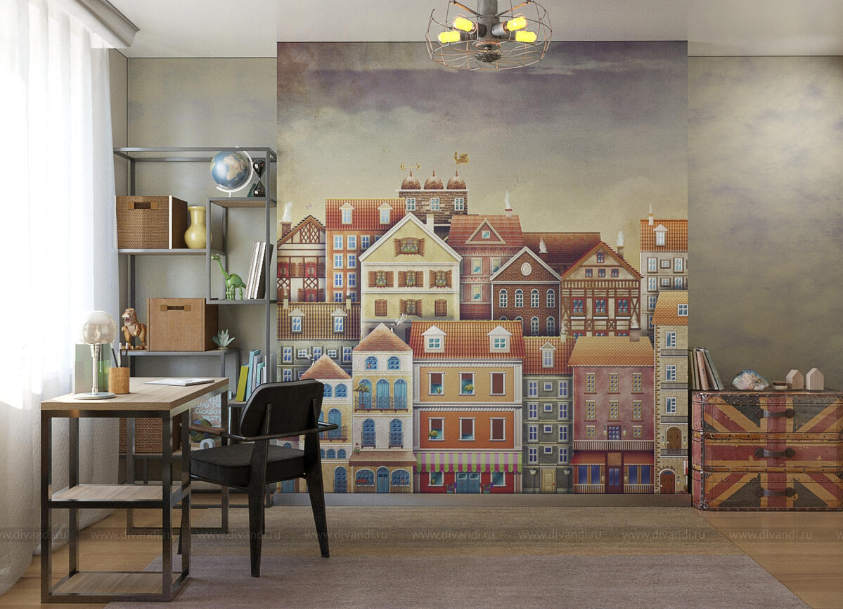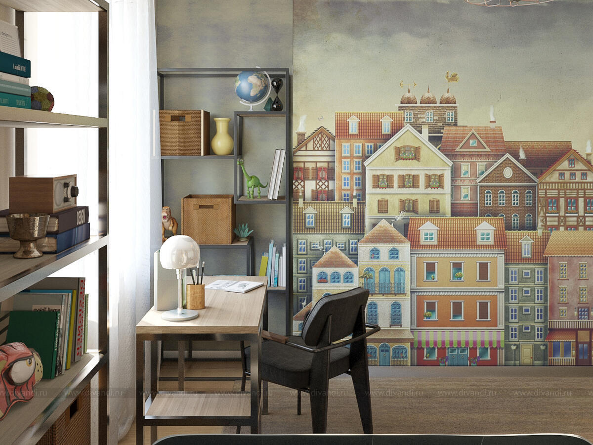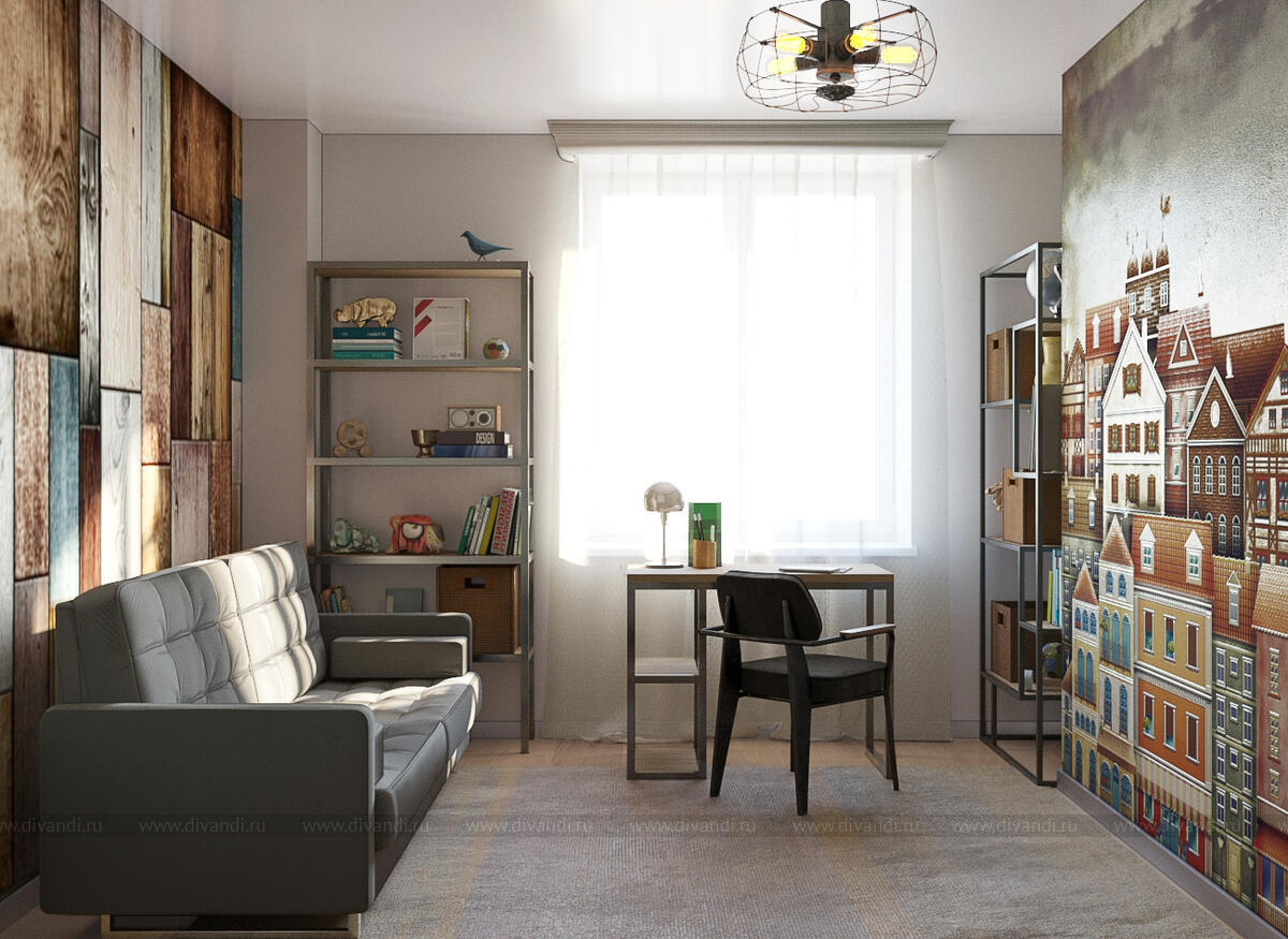 Интерьер лофт не имеет четких границ, подойдет для детской с большим окном, высоким потолком. Для стен выбираются нейтральные цвета, которые дополняются ярким декором и текстилем.