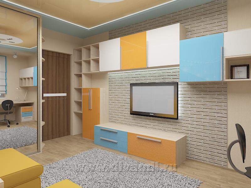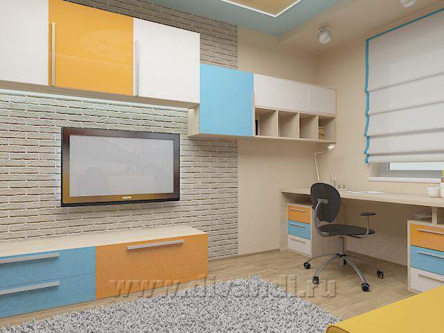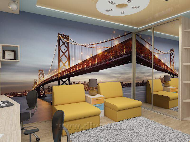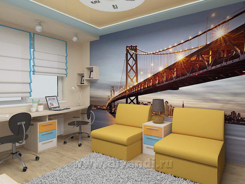Проект детской комнаты для 2х братьев, изюминкой является фотопанно с изображением уходящего в перспективу моста и использование в оформлении стен декоративного кирпича.