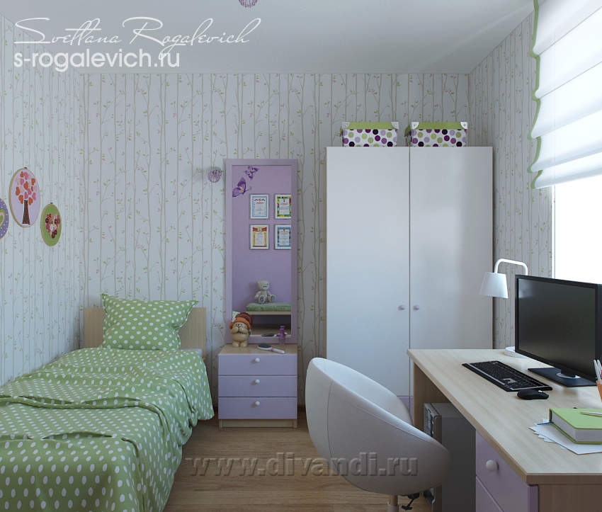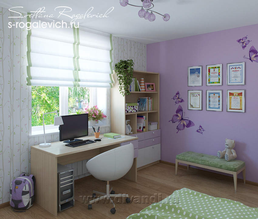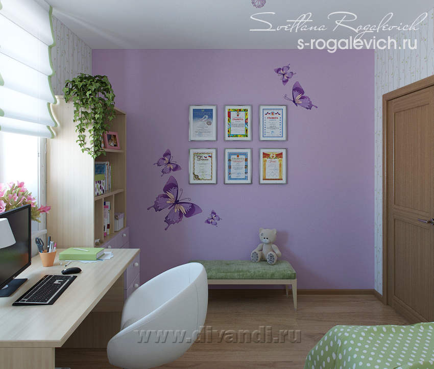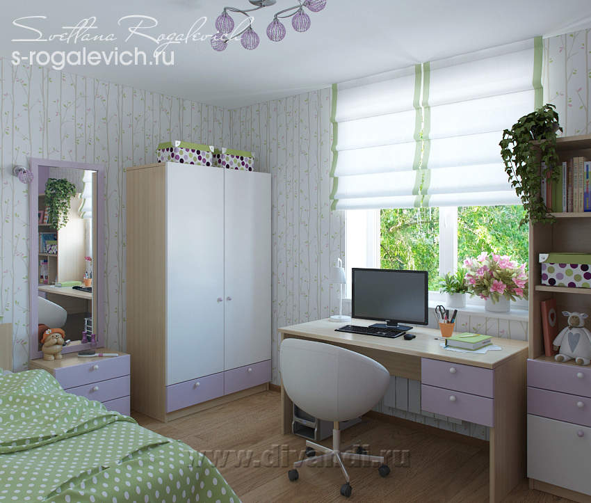 Площадь комнаты невелика - 13 кв. м. Цветовое решение обусловлено пожеланием маленькой хозяйки. Девочка серьезно занимается художественной гимнастикой, является победительницей соревнований и гордится своими достижениями - многочисленным грамотам выделено почетное место на одной из стен.