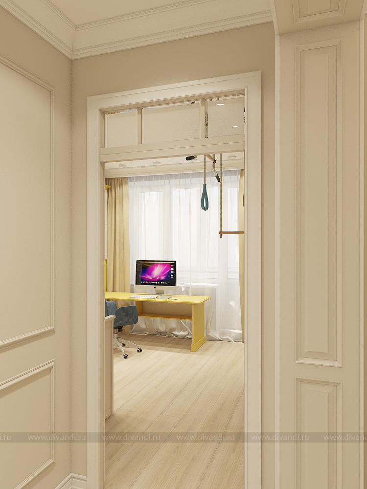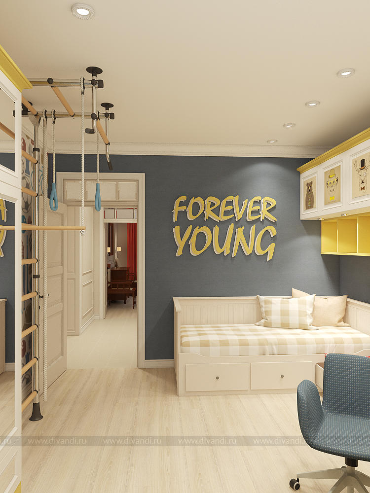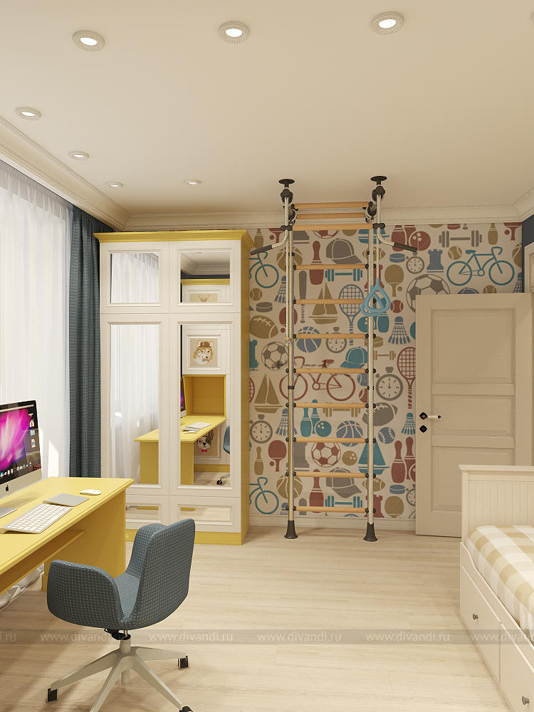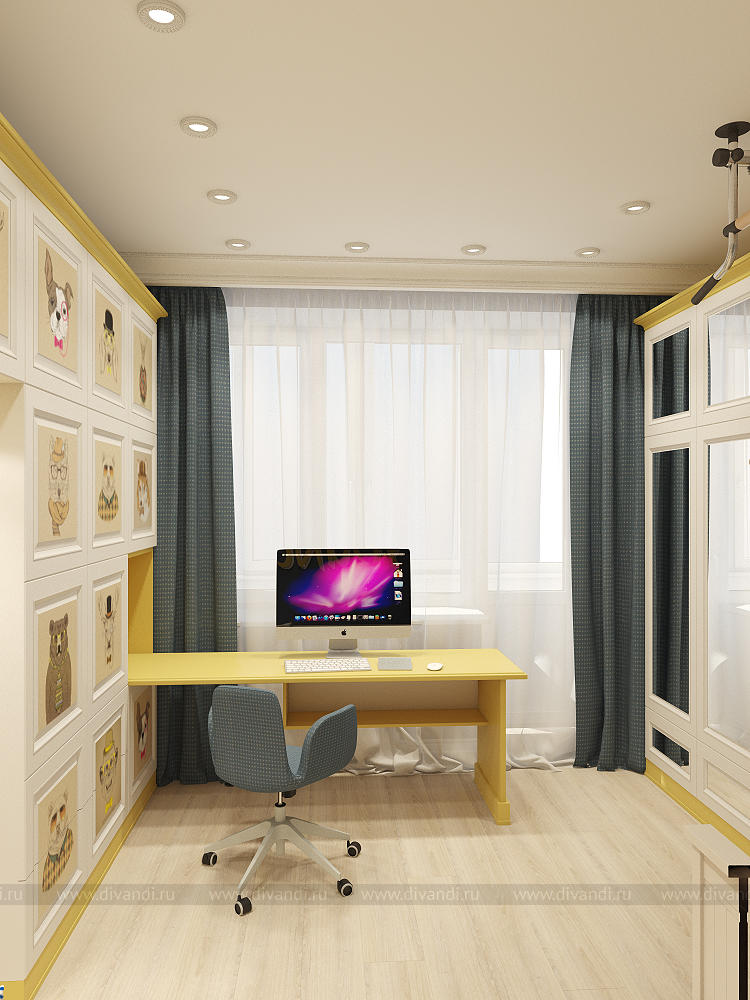 Интерьер комнаты для активного мальчишки 10 лет из нашего большого проекта! Яркий желтый цвет мебели отлично сочетается с серо-голубым цветом штор и стены! Мебель в эту комнату будет делаться индивидуально на нашем столярном производстве по эскизам Студии 33. Кровать из Икеа.