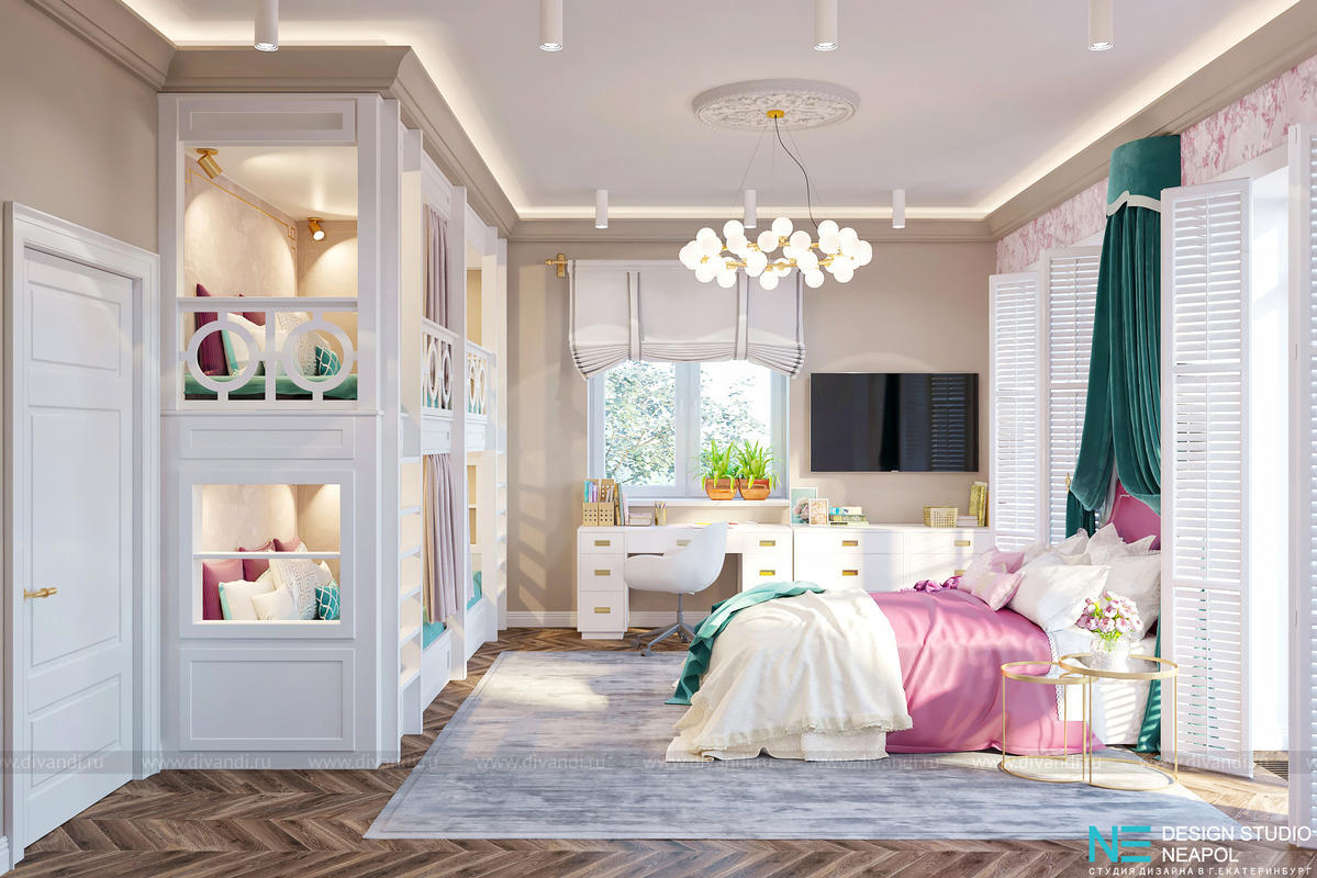 Детская для девочки-подроста в классическом стиле. В проекте необходимо было предусмотреть дополнительные кроватки для друзей и гостей, выделить кровать девочки уютным балдахином и расположить рабочую зону.