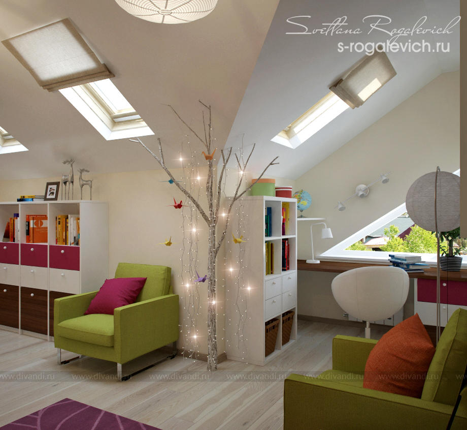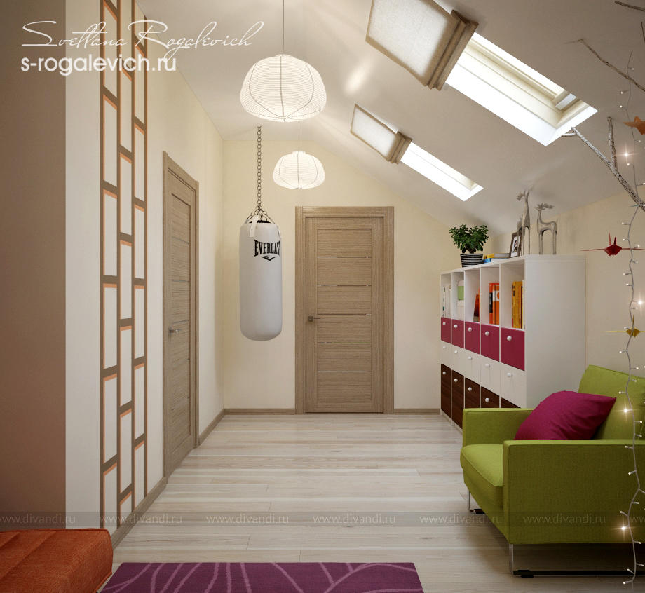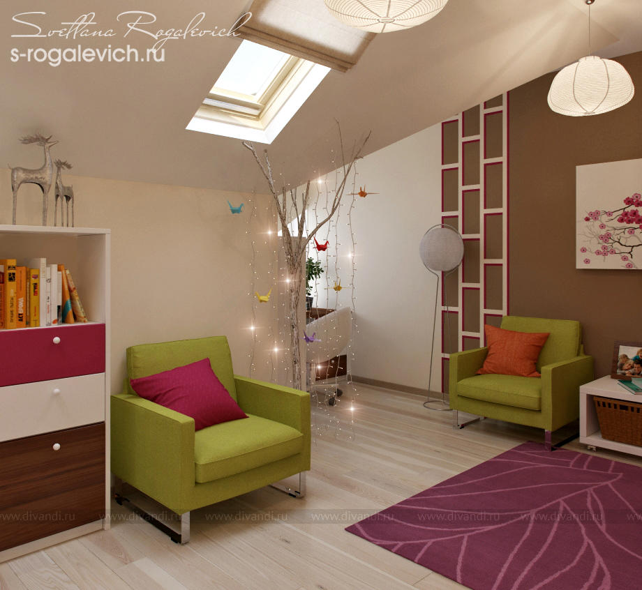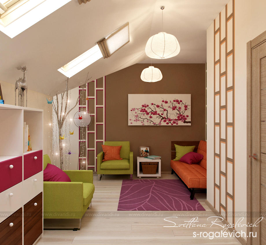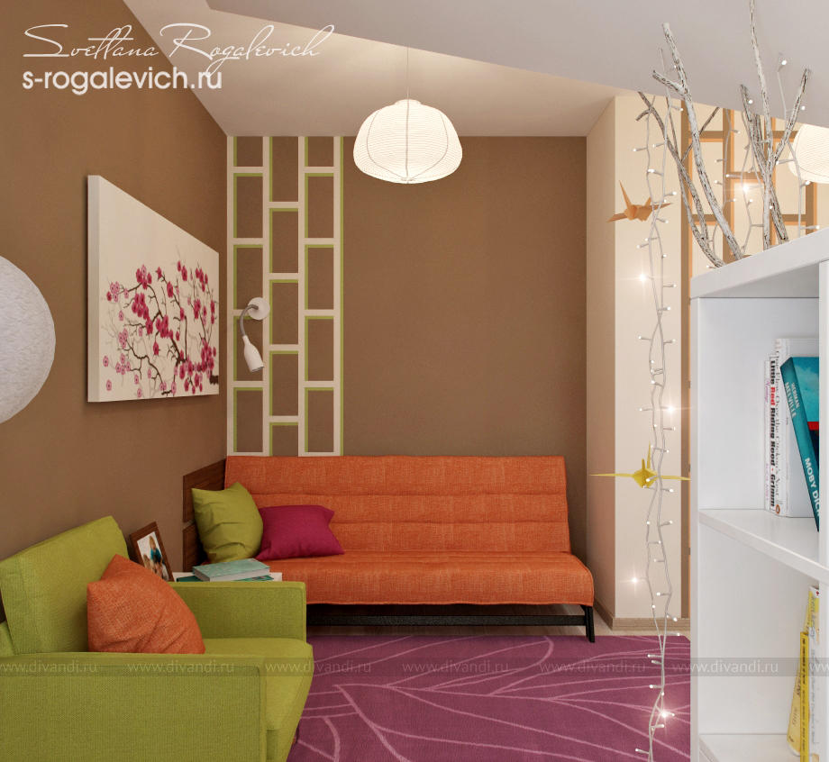Подросток, любитель японской поэзии, очень хотел видеть в своем интерьере картину с веткой сакуры и преобладающие коричневые и бежевые оттенки. К счастью, в процессе сотрудничества с юным заказчиком удалось найти компромисс в плане цветового решения - добавились яркие и контрастные акценты в виде мебели, ковра и декоративного оформления стен.