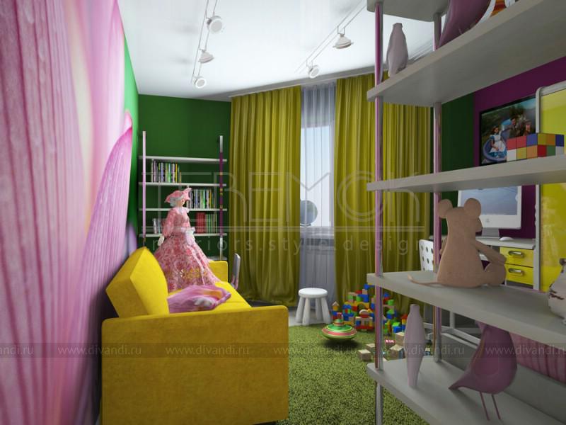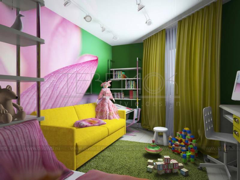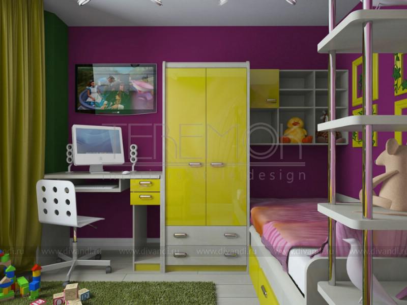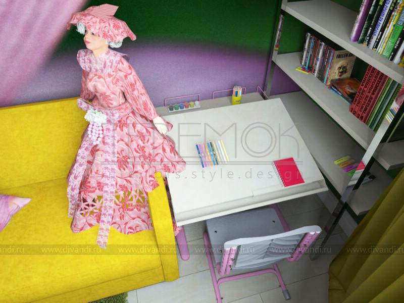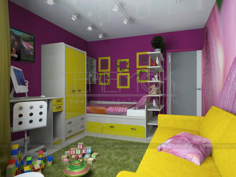 Эту детскую для семилетней девочки мы оформили в очень яркой цветовой гамме. Насыщенные фиолетовые и зеленые стены направлены для создание девичьей атмосферы в комнате. Одну из стен выделили рисунком с цветочной тематикой, которая вбирает в себя все оттенки и уравновешивает сочетание. Яркие желтые акценты в мебели и аксессуарах добавляют жизнерадостности. На небольшом пространстве удалось разместить множество функциональных зон: два рабочих места, кровать, диван, систему хранения.