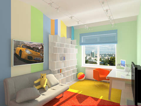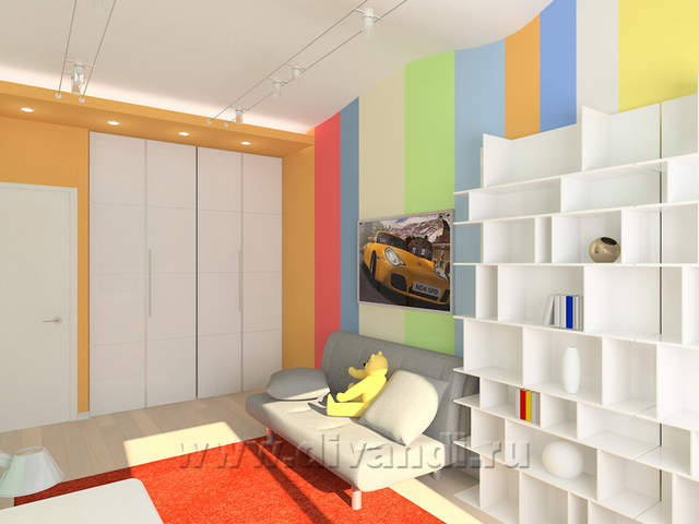 Проектируя детскую для школьника, мы задумываемся о яркой, непосредственной личности человека, поэтому комната становится местом, сочетающим все новое, интересное, неизведанное и живое, нет границам и углам, волнообразный поток мягкий и живой как облако. Палитра стены привносит в комнату природные цвета и уют. Большой рабочий стол позволяет работать за компьютером и выполнять домашние задания. На стеллаже помещаются не только игрушки, но так же книги и школьные учебники. Диван-кровать экономит пространство комнаты, это и место для сна и для приема гостей. В данном интерьере мы использовали светильники на натянутых струнах, они выглядят современно и дают много света, распределяя его по всей комнате, а так же являются оптимальным решением для волнообразного потолка.