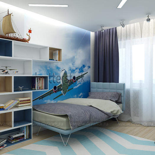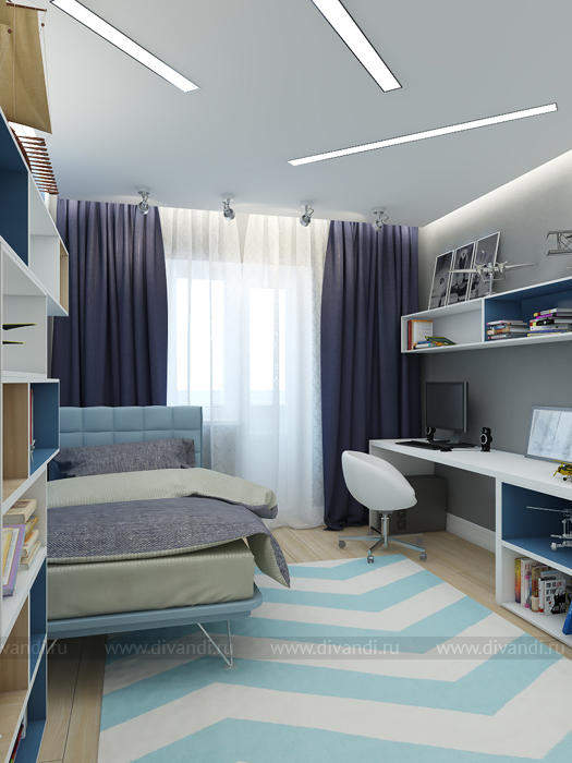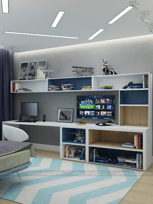 Детская комната для мальчика увлекающегося сборкой моделей самолетов и мечтающего стать пилотом! Так как моделей у него очень много и их нужно куда то расставлять, то в комнате предусмотрена такая мебель что бы максимально закрыть эту потребность, много полок и мест для хранения!